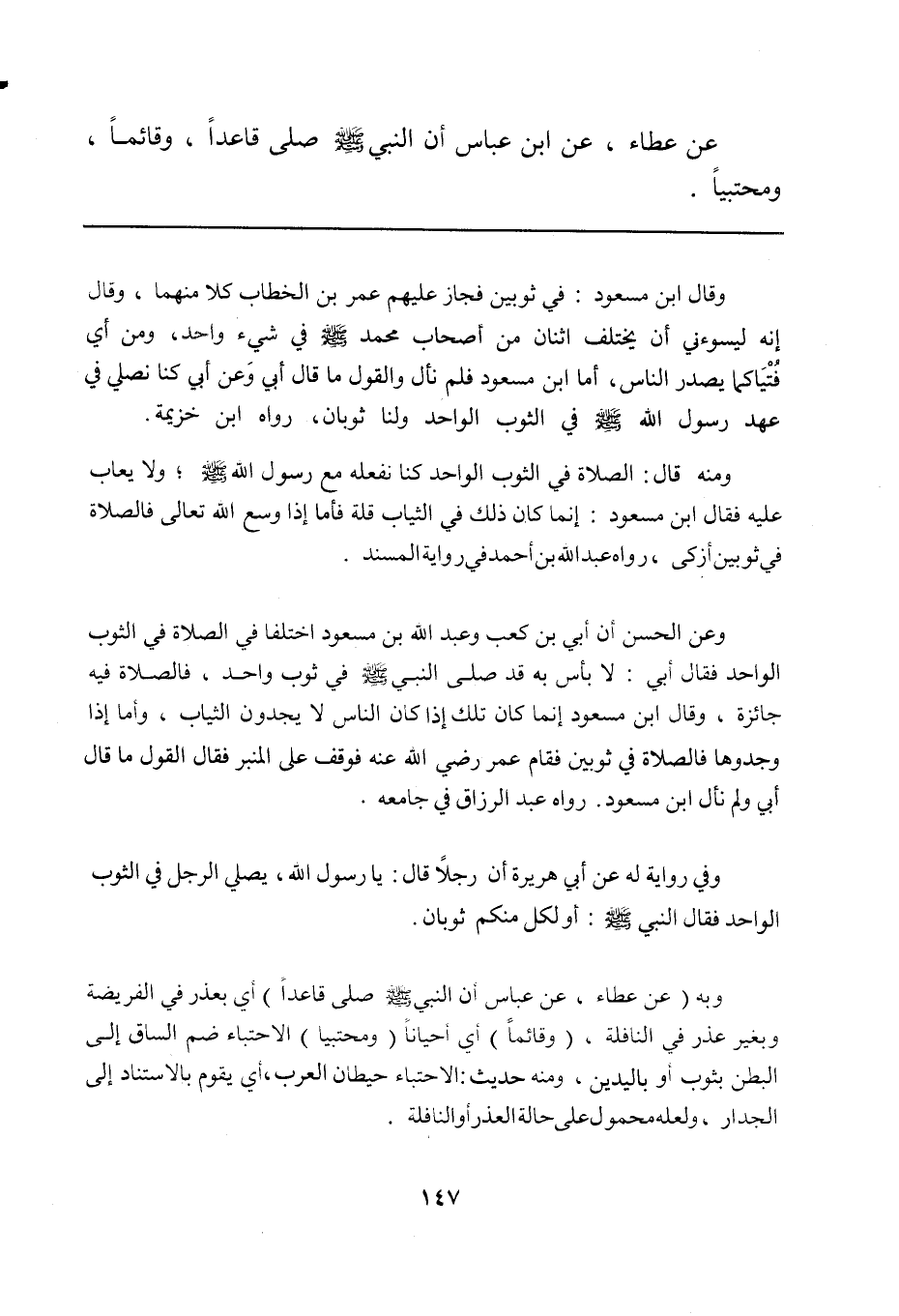 ومنه قال: الصلاة في الثوب الواحد كنا نفعله مع رسول الله صلى الله عليه وسلم، ولا يعاب عليه فقال ابن مسعود: إنما كان ذلك في الثياب قلة فأما إذا وسع الله تعالى فالصلاة في ثوبين أزكى، رواه عبد الله بن أحمد في رواية المسند.