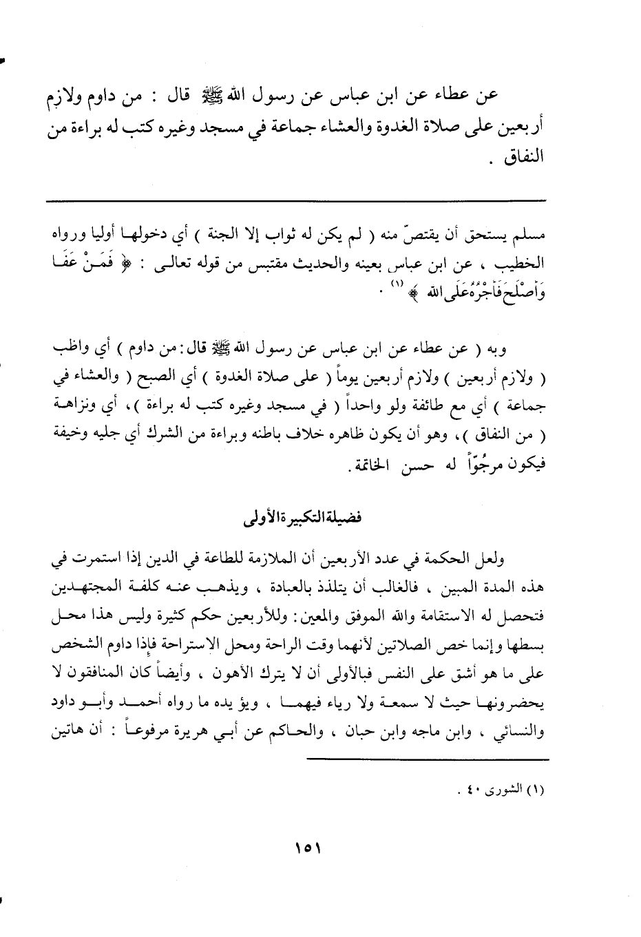 ولعل الحكمة في عدد الأربعين أن الملازمة للطاعة في الدين إذا استمرت في هذه المدة المبينة، فالغالب أن يتلذذ بالعبادة، ويذهب عنه كلفة المجتهدين فتحصل له الاستقامة والله الموفق والمعين: وللأربعين حكم كثيرة وليس هذا محل بسطها وإنما خص الصلاتين لأنهما وقت الراحة ومحل الاستراحة فإذا داوم الشخص على ما هو أشق على النفس فبالأولى أن لا يترك الأهون، وأيضاً كان المنافقون لا يحضرونها حيث لا سمعة ولا رياء فيهما، ويؤيده ما رواه أحمد وأبو داود والنسائي، وابن ماجه وابن حبان، والحاكم عن أبي هريرة مرفوعاً: أن هاتين
