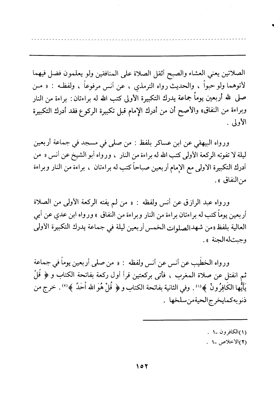 ورواه البيهقي عن ابن عساكر بلفظ: من صلى في مسجد في جماعة أربعين ليلة لا تفوته الركعة الأولى كتب الله له براءة من النار، ورواه أبو الشيخ عن أنس "من أدرك التكبيرة الأولى مع الإمام أربعين صباحاً كتب له براءتان، براءة من النار وبراءة من النفاق".