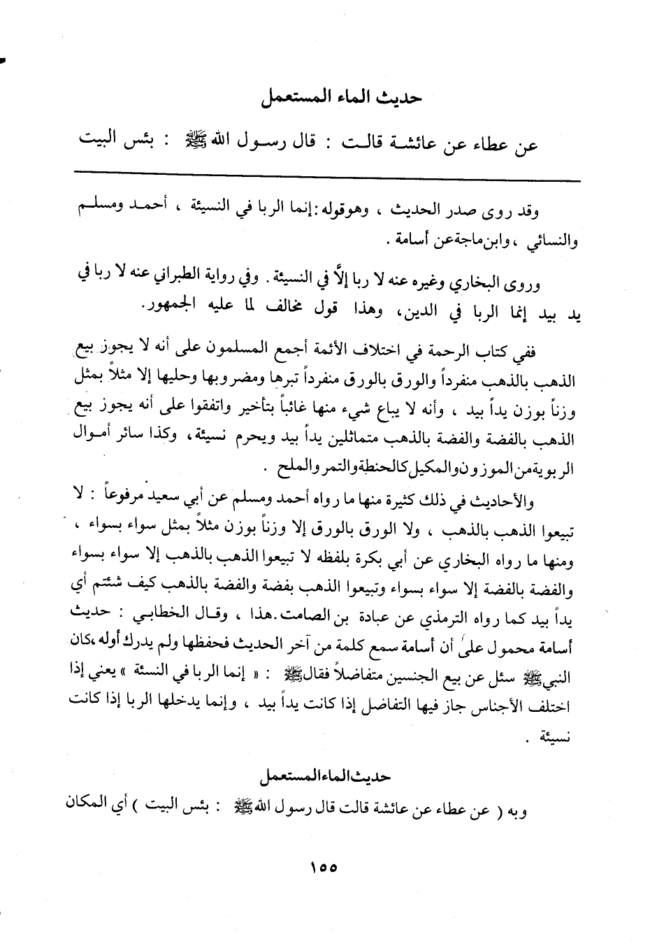 والأحاديث في ذلك كثيرة منها مارواه أحمد ومسلم عن أبي سعيد مرفوعاً: لا تبيعوا الذهب بالذهب، ولا الورق بالورق إلا وزناً بوزن مثلاً بمثل سواء بسواء ومنها مارواه البخاري عن أبي بكر بلفظه لا تبيعوا الذهب بالذهب إلا سواء بسواء والفضة بالفضة إلا سواء بسواء وتبيعوا الذهب بفضة والفضة بالذهب كيف شئتم أي يد بيد كما رواه الترمذي عن عبادة بن الصامت. هذا، وقال الخطابي: حديث أسامة محمول على أن أسامة سمع كلمة من آخر الحديث فحفظها ولم يدرك أوله، كان النبي صلى الله عليه وسلم سئل عن بيع الجنسين متفاضلاً فقال صلى الله عليه وسلم: "إنما الربا في النسئة" يعني إذا اختلف الأجناس جاز فيها التفاضل إذا كانت يداً بيد، وإنما يدخلها الربا إذا كانت نسيئة.