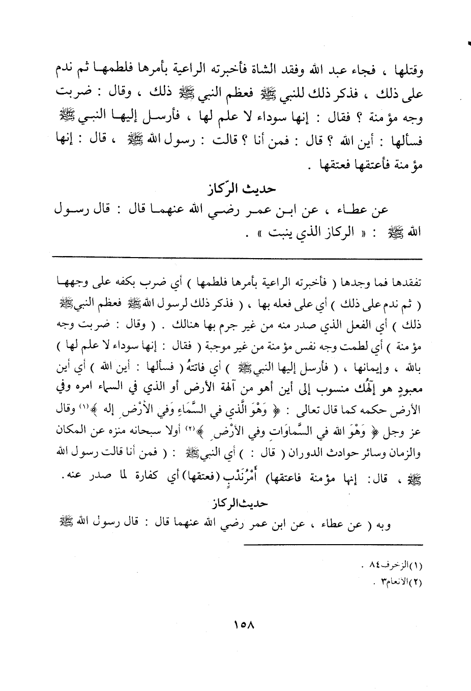 تفقدها فما وجدها (فأخبرته الراعية بأمرها فلطمها) أي ضرب بكفه على وجهها (ثم ندم على ذلك) أي على فعله بها، (فذكر ذلك لرسول الله صلى الله عليه وسلم فعظم النبي صلى الله عليه وسلم ذلك) أي الفعل الذي صدر منه من غير جرم بها هنالك. (وقال: ضربت وجه مؤمنة) أي لطمت وجه نفس مؤمنة من غير موجبة (فقال: إنها سوداء لا علم لها) بالله، وإيمانها، (فأرسل إليها النبي صلى الله عليه وسلم) أي فأتتهُ (فسألها: أين الله) أي أين معبودٍ هو إلهُك منسوب إلى أين أهو من آلهة الأرض أو الذي في السماء أمره وفي الأرض حكمه كما قال تعالى: {وَهْوَ الَّذي في السَّمَاءِ إله وَفي الأرضِ إله} (¬1) وقال عز وجل {وَهوَ الله في السَّماوَاتِ وفي الأرْضِ} (¬2) أولاً سبحانه منزه عن المكان والزمان وسائر حوادث الدوران (قال:) أي النبي صلى الله عليه وسلم: (فمن أنا قالت رسول الله صلى الله عليه وسلم، قال: إنها مؤمنة فأعتقها) أَمْرُ نَدْبٍ (فعتقها) أي كفارة لما صدر عنه.
