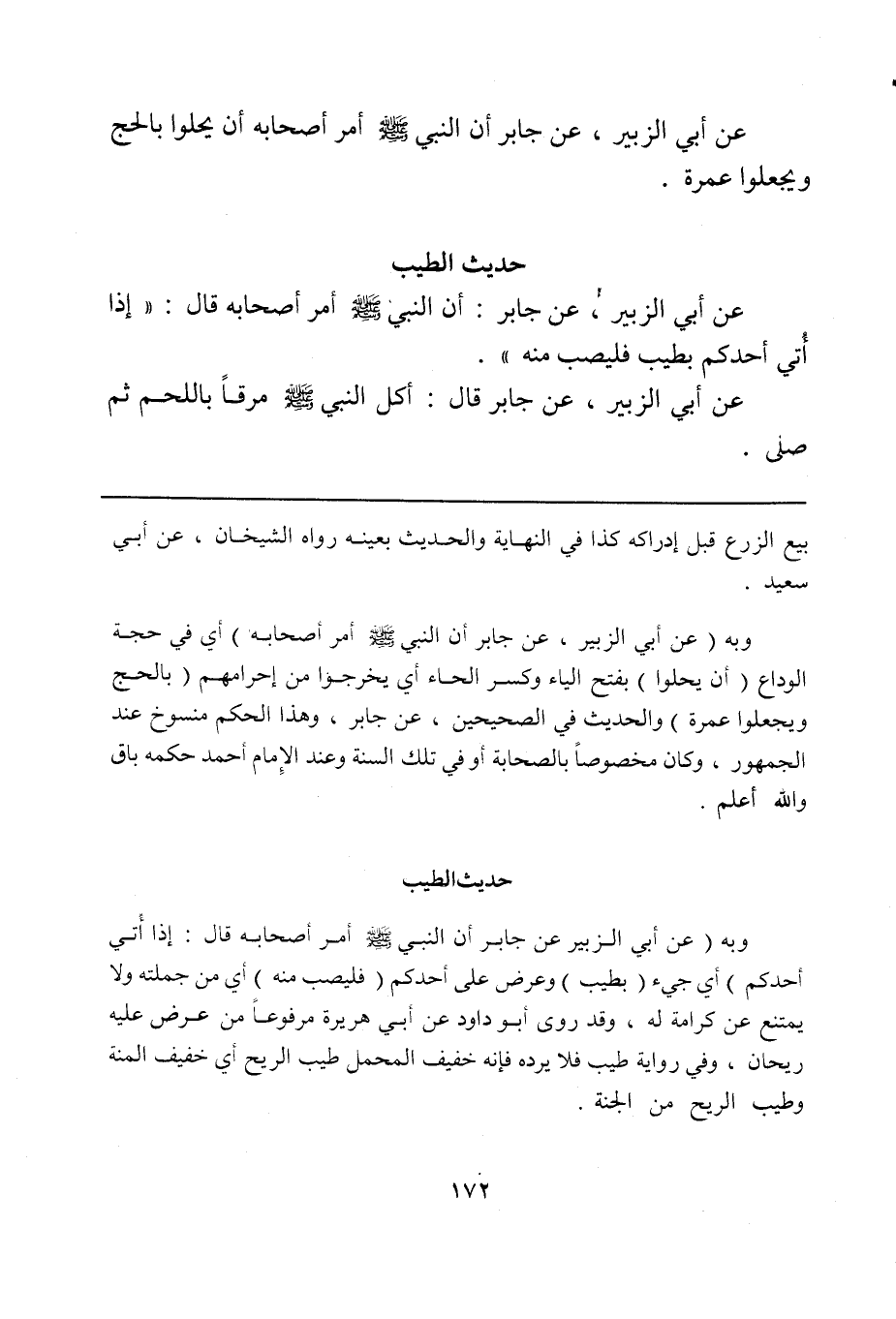 وبه (عن أبي الزبير عن جابر أن النبي صلى الله عليه وسلم أمر أصحابه قال: إذا أُتي أحدكم) أي جيء (بطيب) وعرض على أحدكم (فليصب منه) أي من جملته ولا يمتنع عن كرامة له، وقد روى أبو داود عن أبي هريرة مرفوعاً من عرض عليه ريحان، وفي رواية طيب فلا يرده فإنه خفيف المحمل طيب الريح أي خفيف المنة وطيب الريح من الجنة.