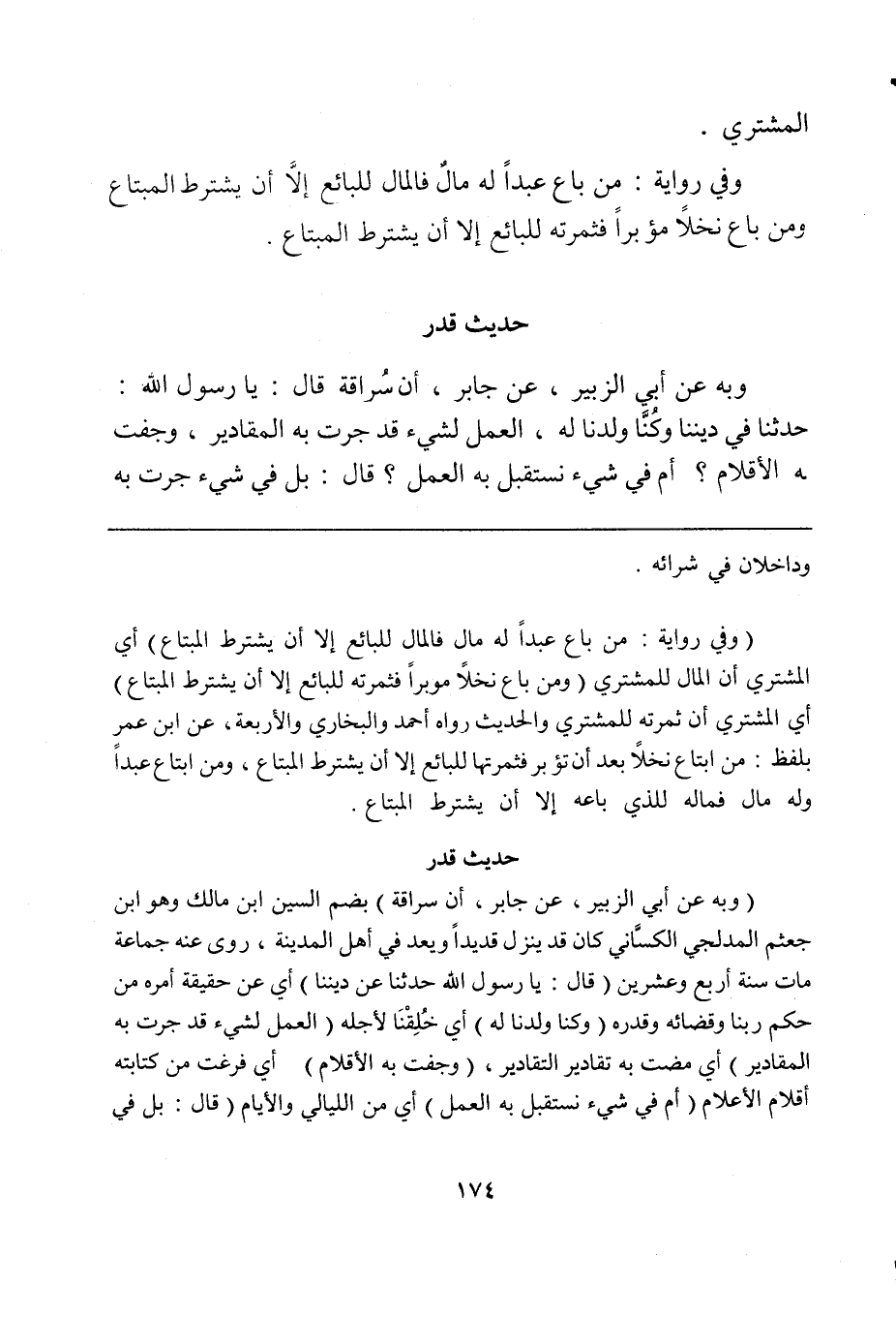 (وبه عن أبي الزبير، عن جابر، أن سراقة) بضم السين ابن مالك وهو ابن جعثم المدلجي الكسَّاني كان قد ينزل قديداً ويعد في أهل المدينة، روى عنه جماعة، مات سنة أربع وعشرين (قال: يا رسول الله حدثنا عن ديننا) أي عن حقيقة أمره من حكم ربنا وقضائه وقدره (وكنا ولدنا له) أي خُلِقْنَا لأجله (العمل لشيء قد جرت به المقادير) أي مضت به تقادير التقادير، (وجفت به الأقلام) أي فرغت من كتابته أقلام الأعلام (أم في شيء نستقبل به العمل) أي من الليالي والأيام (قال: بل في