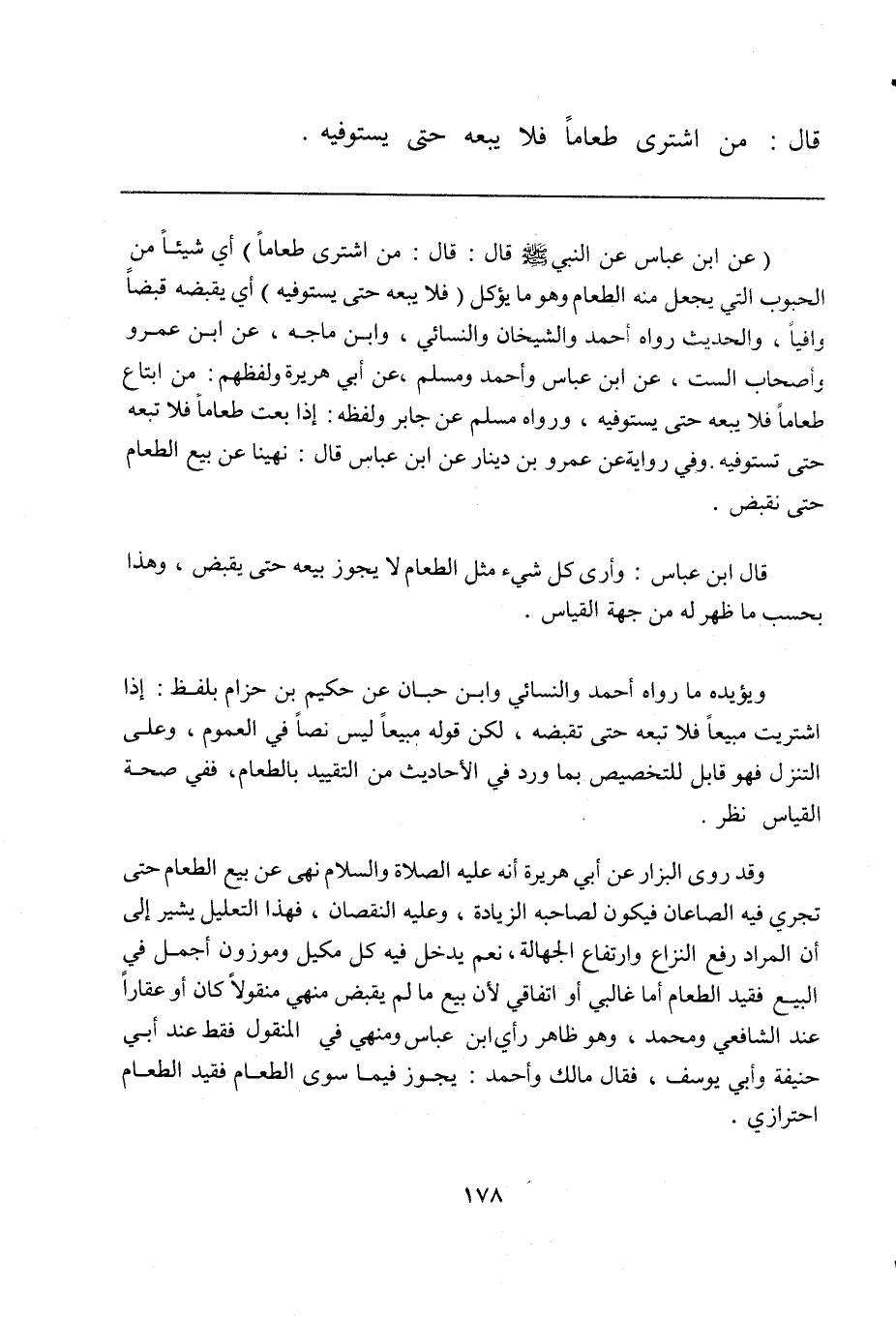 (عن ابن عباس عن النبي صلى الله عليه وسلم قال: قال: من اشترى طعاماً) أي شيئاً من الحبوب التي يجعل منه الطعام وهو ما يؤكل (فلايبعه حتى يستوفيه) أي يقبضه قبضاً وافياً، والحديث رواه أحمد والشيخان والنسائي، وابن ماجه، عن ابن عمرو وأصحاب الست، عن ابن عباس وأحمد ومسلم، عن أبي هريرة ولفظهم: من ابتاع طعاماً فلا يبعه حتى يستوفيه، ورواه مسلم عن جابر ولفظه: إذا بعت طعاماً فلا تبعه حتى تستوفيه. وفي رواية عن عمرو بن دينار عن ابن عباس قال: نهينا عن بيع الطعام حتى نقبض.