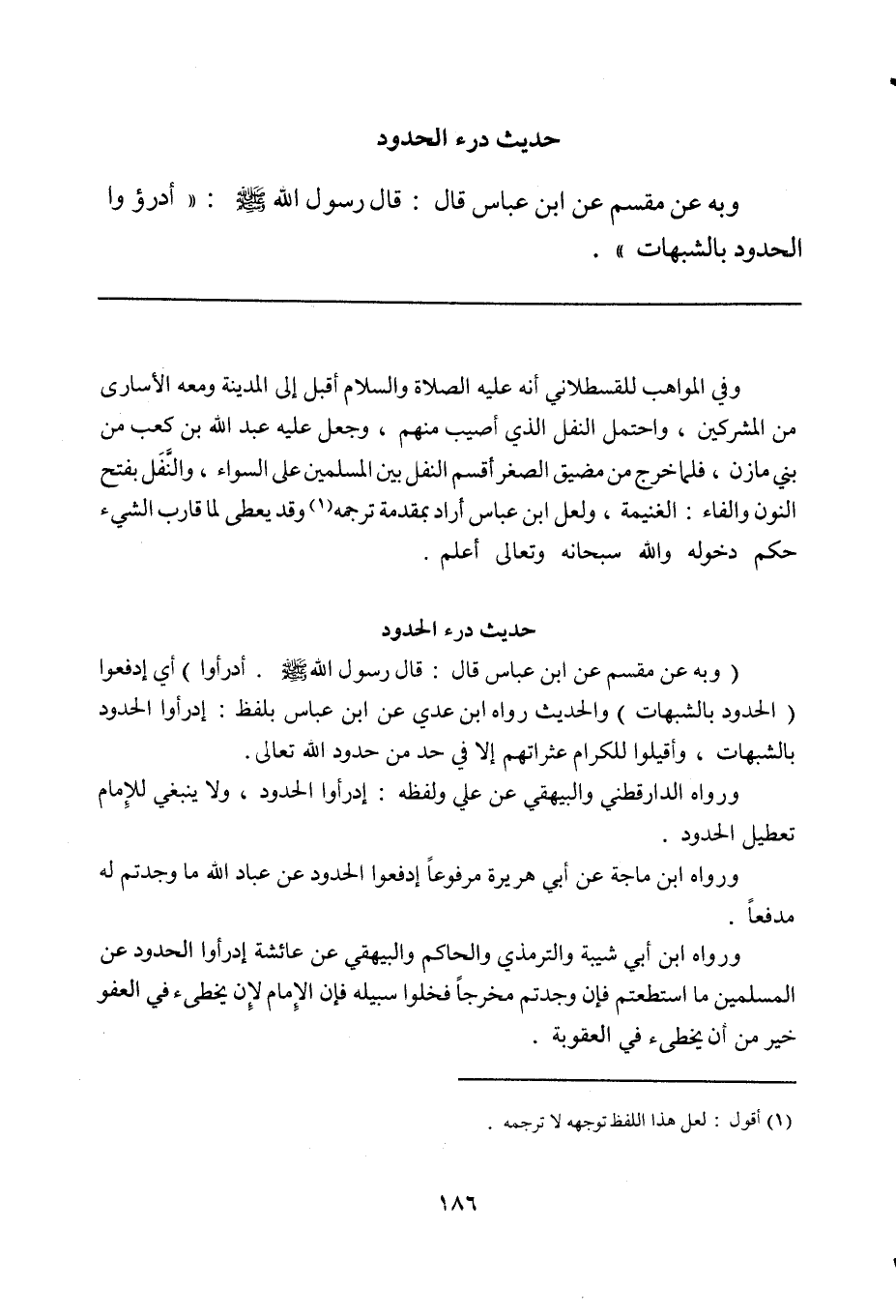 (وبه مقسم عن ابن عباس قال: قال رسول الله صلى الله عليه وسلم إدرأوا) أي ادفعوا (الحدود بالشبهات) والحديث رواه ابن عدي عن ابن عباس بلفظ: إدرأوا الحدود بالشبهات، وأقيلوا للكرام عثراتهم إلا في حد من حدود الله تعالى.