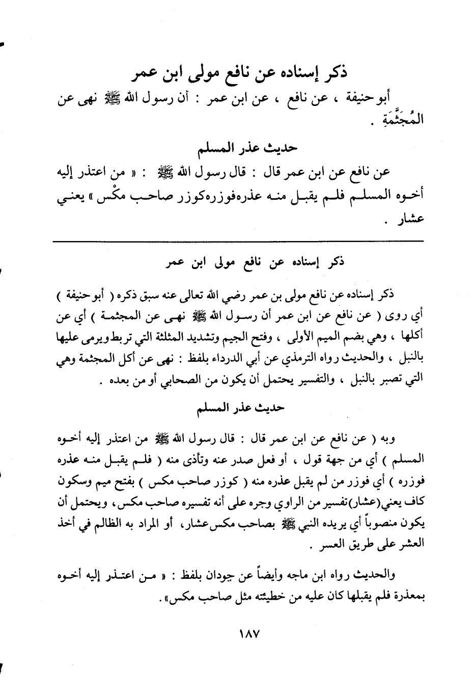 وبه (عن نافع عن ابن عمر قال: قال رسول الله صلى الله عليه وسلم من اعتذر إليه أخوه المسلم) أي من جهة قول، أو فعل صدر عنه وتأذى منه (فلم يقبل منه عذره فوزره) أي فوزر من لم يقبل عذره منه (كوزر صاحب مكس) بفتح ميم وسكون كاف يعني (عشار) تفسير من الراوي وجره على أنه تفسيره صاحب مكس، ويحتمل أن يكون منصوباً أي يريده النبي صلى الله عليه وسلم بصاحب مكس عشار، أو المراد به الظالم في أخذ العشر على طريق العسر.