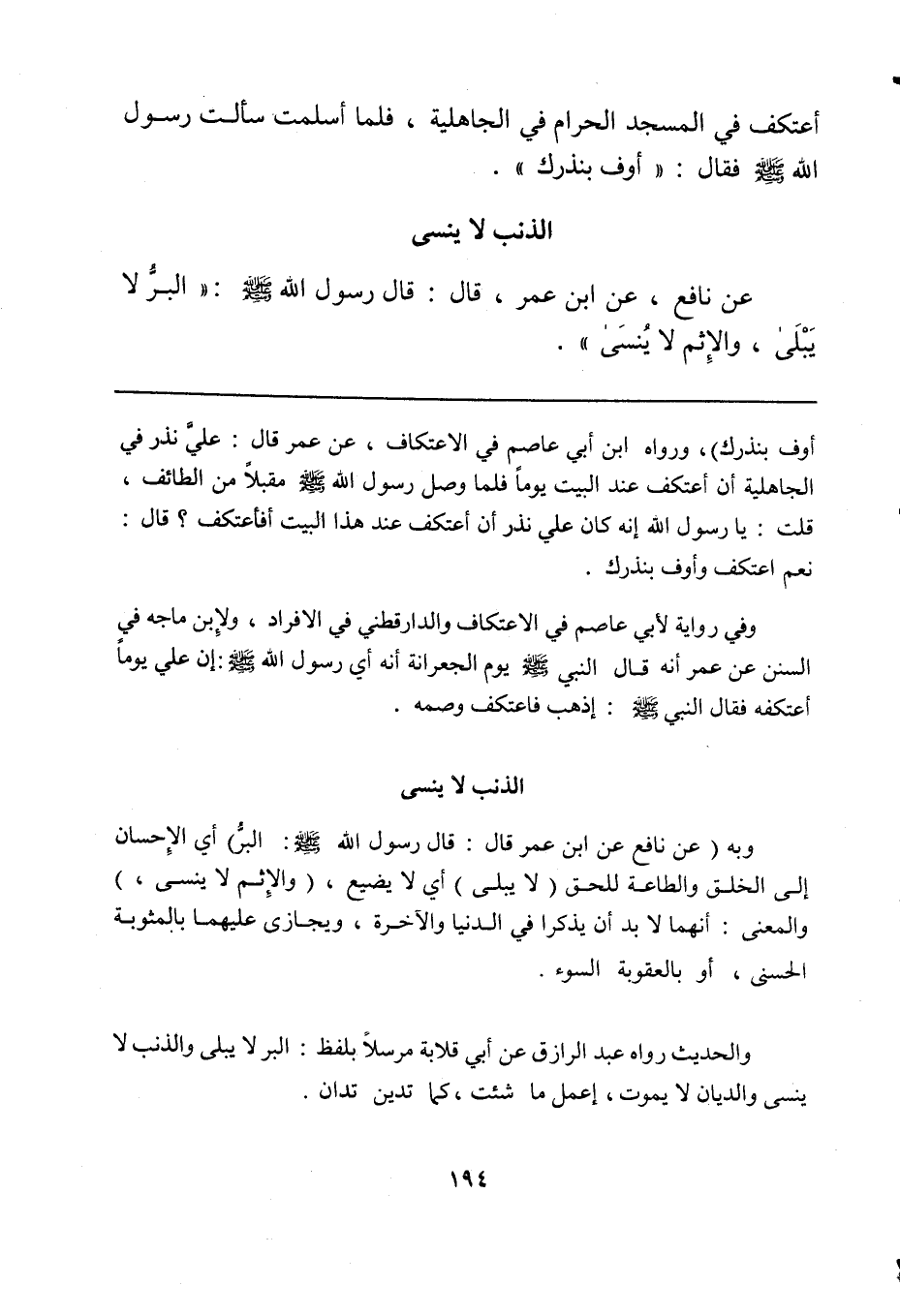 أوف بنذرك)، ورواه ابن أبي عاصم في الاعتكاف، عن عمر قال: عليَّ نذر في الجاهلية أن أعتكف عند البيت يوماً فلما وصل رسول الله صلى الله عليه وسلم مقبلاً من الطائف، قلت: يا رسول الله إنه كان علي نذر أن أعتكف عند هذا البيت أفأعتكف؟ قال: نعم اعتكف وأوف بنذرك.