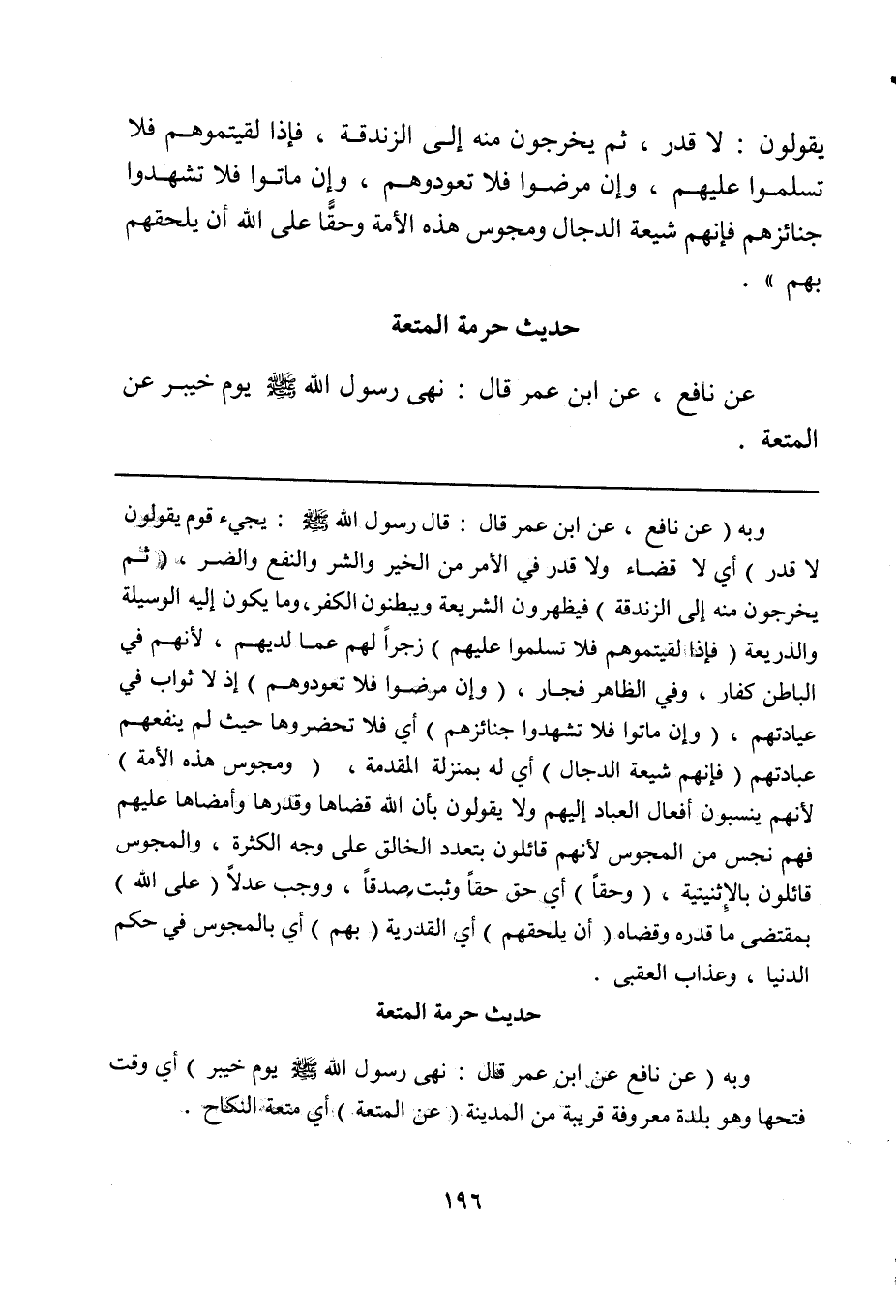 وبه (عن نافع، عن ابن عمر قال: قال رسول الله صلى الله عليه وسلم: يجيء قوم يقولون لا قدر) أي لا قضاء ولا قدر في الأمر من الخير والشر والنفع والضر، (ثم يخرجون منه إلى الزندقة) فيظهرون الشريعة ويبطنون الكفر، وما يكون إليه الوسيلة والذريعة (فإذا لقيتموهم فلا تسلموا عليهم) زجراً لهم عما لديهم، لأنهم في الباطن كفار، وفي الظاهر فجار، (وإن مرضوا فلا تعودوهم) إذ لا ثواب في عيادتهم، (وإن ماتوا فلا تشهدوا جنائزهم) أي فلا تحضروها حيث لم تنفعهم عبادتهم (فإنهم شيعة الدجال) أي له بمنزلة المقدمة، (ومجوس هذه الأمة) لأنهم ينسبون أفعال العباد إليهم ولا يقولون بأن الله قضاها وقدرها وأمضاها عليهم فهم أنجس من المجوس لأنهم قائلون بتعدد الخالق على وجه الكثرة، والمجوس قائلون بالإثنينية، (وحقاً) أي حق حقاً وثبت صدقاً، ووجب عدلاً (على الله) بمقتضى ما قدره وقضاه (أن يلحقهم) أي القدرية (بهم) أي بالمجوس في حكم الدنيا، وعذاب العقبى.
