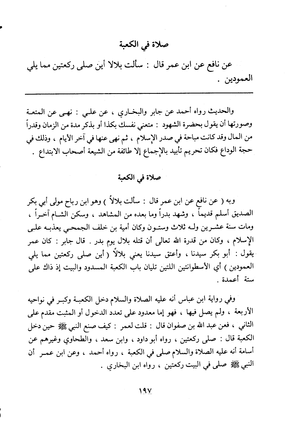 وفي رواية ابن عباس أنه عليه الصلاة والسلام دخل الكعبة وكبر في نواحيها الأربعة، ولم يصل فيها، فهو إما معدود على تعدد الدخول أو المثبت مقدم على الثاني، فعن عبد الله بن صفوان قال: قلت لعمر: كيف صنع النبي صلى الله عليه وسلم حين دخل الكعبة قال: صلى ركعتين، رواه أبو داود، وابن سعد، والطحاوي وغيرهم عن أسامة أنه عليه الصلاة والسلام صلى في الكعبة، رواه أحمد، وعن ابن عمر أن النبي صلى الله عليه وسلم صلى في البيت ركعتين، رواه ابن البخاري.