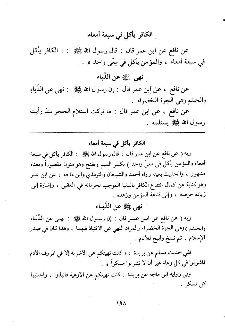 وبه (عن نافع عن ابن عمر قال: قال رسول الله صلى الله عليه وسلم: الكافر يأكل في سبعة أمعاء والمؤمن يأكل في معىً واحد) بكسر الميم وبفتح وهو منون مقصوراً ومعناه مشهور، والحديث بعينه رواه أحمد والشيخان والترمذي وابن ماجه، عن ابن عمر وهو كناية عن كمال انتفاع الكافر بالدنيا الموجب لحرمانه في العقبى، وإشارة إلى زيادة حرصه، وإلى قناعة المؤمن وزهده.