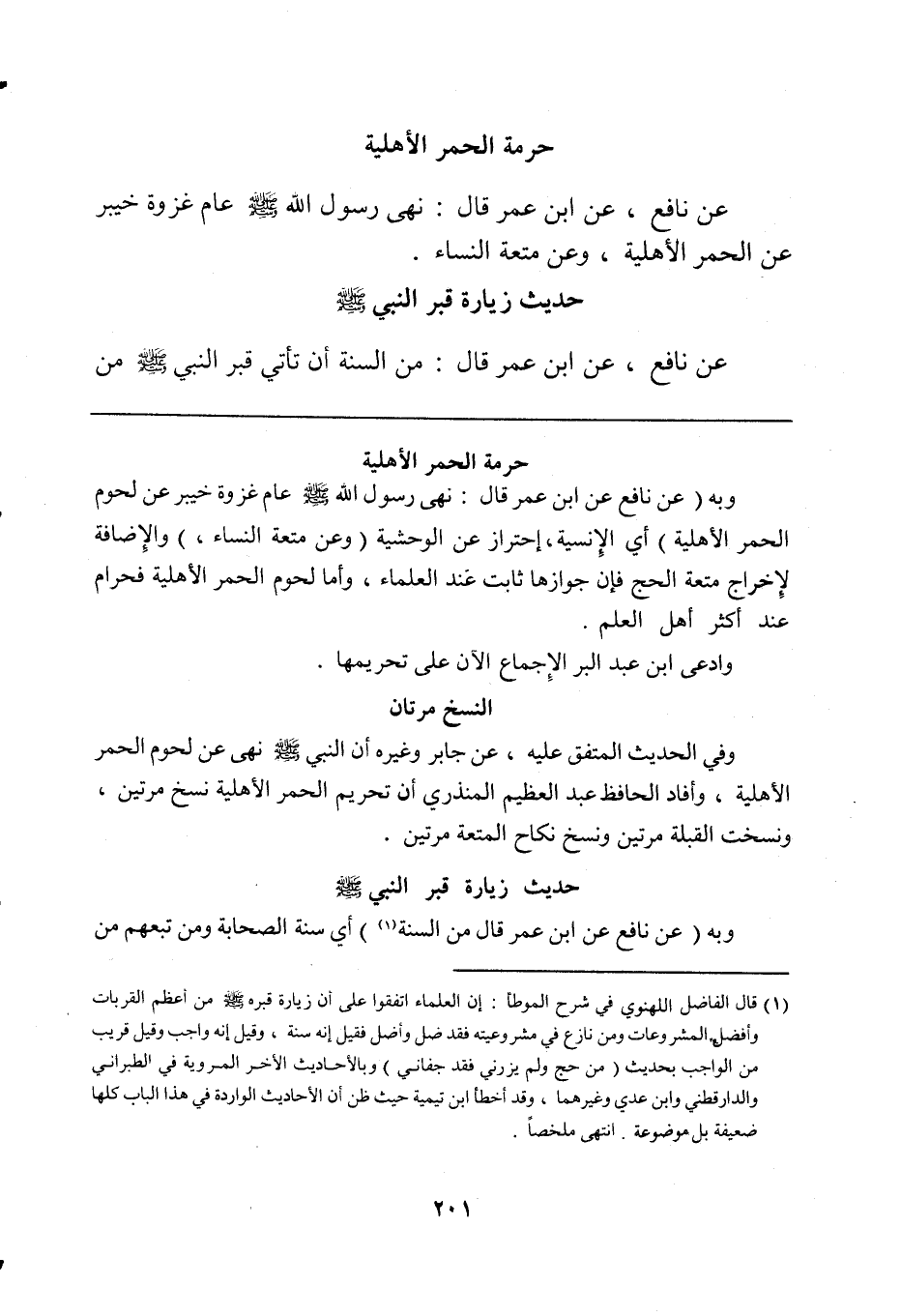 (¬1) قال الفاضل اللهنوي في شرح الموطأ: إن العلماء اتفقوا على أن زيارة قبره صلى الله عليه وسلم من أعظم القربات وأفضل المشروعات ومن نازع في مشروعيته فقد ضل وأضل فقيل إنه سنة، وقيل إنه واجب وقيل قريب من الواجب بحديث (من حج ولم يزرني فقد جفاني) وبالأحاديث الأخر المروية في الطبراني والدارقطني وابن عدي وغيرهما، وقد أخطأ ابن تيمية حيث ظن أن الأحاديث الواردة في هذا الباب كلها ضعيفة بل موضوعة. انتهى ملخصاً.