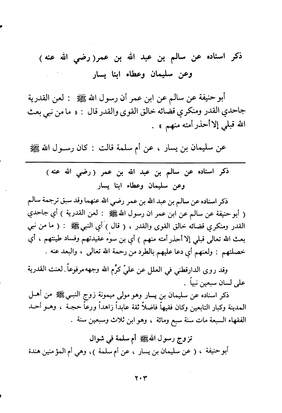 ذكر إسناده عن سالم بن عبد الله بن عمر رضي الله عنهما وقد سبق ترجمة سالم (أبو حنيفة عن سالم عن ابن عمر أن رسول الله صلى الله عليه وسلم: لعن القدرية) أي جاحدي القدر ومنكري قضائه خالق القوى والقدر، (قال) أي النبي صلى الله عليه وسلم: (ما من نبي بعث الله تعالى قبلي إلا أحذر أمته منهم) أي من سوء عقيدتهم وفساد طينتهم، أي خصلتهم: ولعنهم أي دعا عليهم بالطرد من رحمة الله تعالى، والبعد عنه.