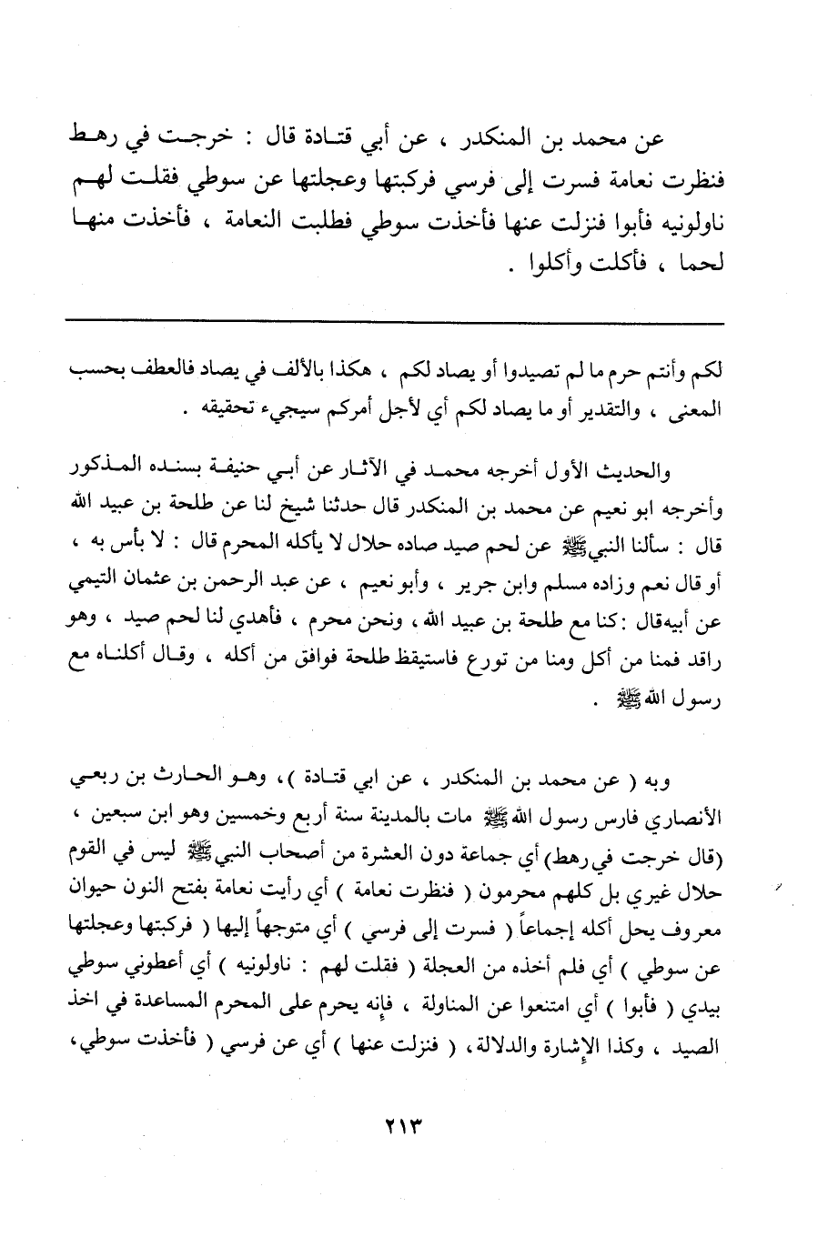 والحديث الأول أخرجه محمد في الآثار عن أبي حنيفة بسنده المذكور وأخرجه أبو نعيم عن محمد بن المنكدر قال حدثنا شيخ لنا عن طلحة بن عبيد الله قال: سألنا النبي صلى الله عليه وسلم عن لحم صيد صاده حلال لا يأكله المحرم قال: لا بأس به، أو قال نعم وزاده مسلم وابن جرير، وأبو نعيم، عن عبد الرحمن بن عثمان التيمي عن أبيه قال: كنا مع طلحة بن عبيد الله، ونحن محرم، فأهدي لنا لحم صيد، وهو راقد فمنا من أكل ومنا من تورع فاستيقظ طلحة فوافق من أكله، وقال أكلناه مع رسول الله صلى الله عليه وسلم.