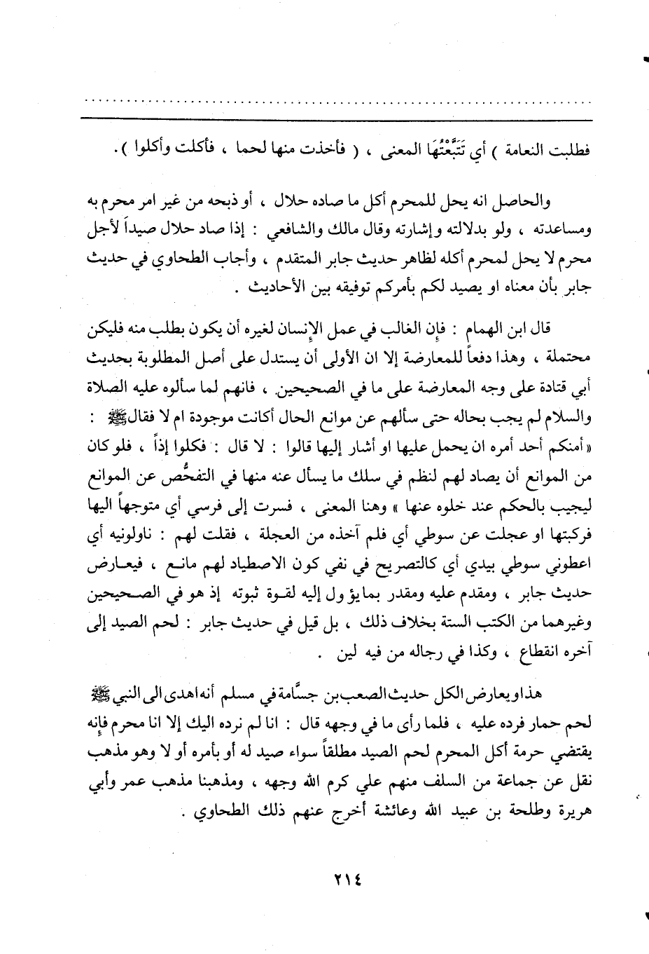 والحاصل أنه يحل للمحرم أكل ما صاده حلال، أو ذبحه من غير أمر محرم به ومساعدته، ولو بدلالته وإشارته وقال مالك والشافعي: إذا صاد حلال صيداً لأجل محرم لا يحل لمحرم أكله لظاهر حديث جابر المتقدم، وأجاب الطحاوي في حديث جابر بأن معناه أو يصيد لكم بأمركم توفيقه بين الأحاديث.