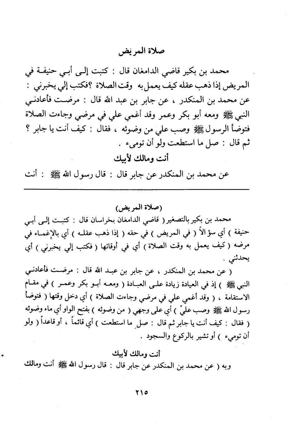 (عن محمد بن المنكدر، عن جابر بن عبد الله قال: مرضت فأعادني النبي صلى الله عليه وسلم) إذ في العيادة زيادة على العبادة (ومعه أبو بكر وعمر) في مقام الاستقامة، (وقد أغمي علي في مرضي وجاءت الصلاة) أي دخل وقتها (فتوضأ رسول الله صلى الله عليه وسلم وصبَّ عليّ) أي على وجهي (من وضوئه) بفتح الواو أي ماء وضوئه (فقال: كيف أنت يا جابر ثم قال: صلِ ما استطعت) أي قائماً، أو قاعداً (ولو أن تومىء) أو تشير بالركوع والسجود.