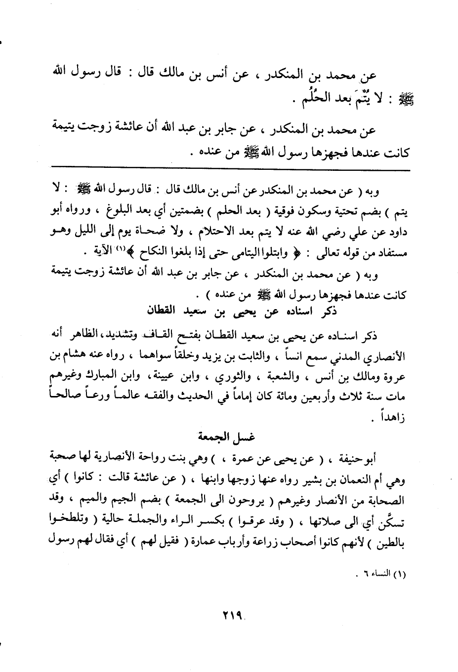 وبه (عن محمد بن المنكدر عن أنس بن مالك قال: قال رسول الله صلى الله عليه وسلم: لا يتم) بضم تحتية وسكون فوقية (بعد الحلم) بضمتين أي بعد البلوغ، ورواه أبو داود عن علي رضي الله عنه لا يتم بعد الاحتلام، ولا ضحاة يوم إلى الليل وهو مستفاد من قوله تعالى: {وابتلوا اليتامى حتى إذا بلغوا النكاح} (¬1) الآية.