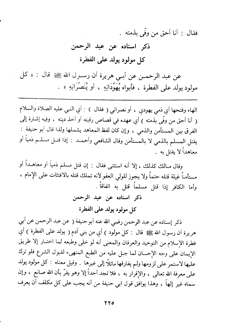 ذكر إسناده عن عبد الرحمن رضي الله عنه أبو حنيفة (عن عبد الرحمن عن أبي هريرة أن رسول الله صلى الله عليه وسلم قال: كل مولود) أي من بني آدم (يولد على الفطرة) أي فطرة الإسلام من التوحيد والعرفان والمعنى أنه لو خلى وطبعه لما اختار إلا طريق الإيمان على وجه الإحسان لما جبل عليه من الطبع المتهيء لقبول الشرع فلو ترك عليها لاستمر على لزومها ولم يفارقها مائلاً إلى غيرها. وقيل معناه: كل مولود يولد على معرفة الله تعالى، والإقرار به، فلا تجد أحداً إلا وهو يقرّ بأن الله صانع، وإن سماه غير إلهاً، وهذا يوافق قول أبي حنيفة من أنه يجب على كل مكلف أن يعرف