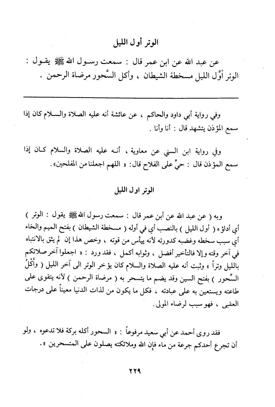 وبه (عن عبد الله عن ابن عمر قال: سمعت رسول الله صلى الله عليه وسلم يقول: الوتر) أي أداؤه (أول الليل) بالنصب أي في أوله (مسخطة الشيطان) بفتح الميم والخاء أي سبب سخطه وغضبه كدورته لأنه ييأس من قوته، وخص هذا إن لم يثق بالانتباه في آخر وقته وإلا فالتأخير أفضل، وثوابه أكمل، فقد ورد: "اجعلوا آخر صلاتكم بالليل وتراً" وثبت أنه عليه الصلاة والسلام كان يؤخر الوتر إلى آخر الليل (وأَكْلُ السَّحور) بفتح السين وقد يضم ما يتسحر به (مرضاة الرحمن) لأنه يتقوى على طاعته ويستعين به على عبادته، فكل ما يكون من لذات الدنيا معيناً على درجات العقبى، فهو سبب لرضاء المولى.