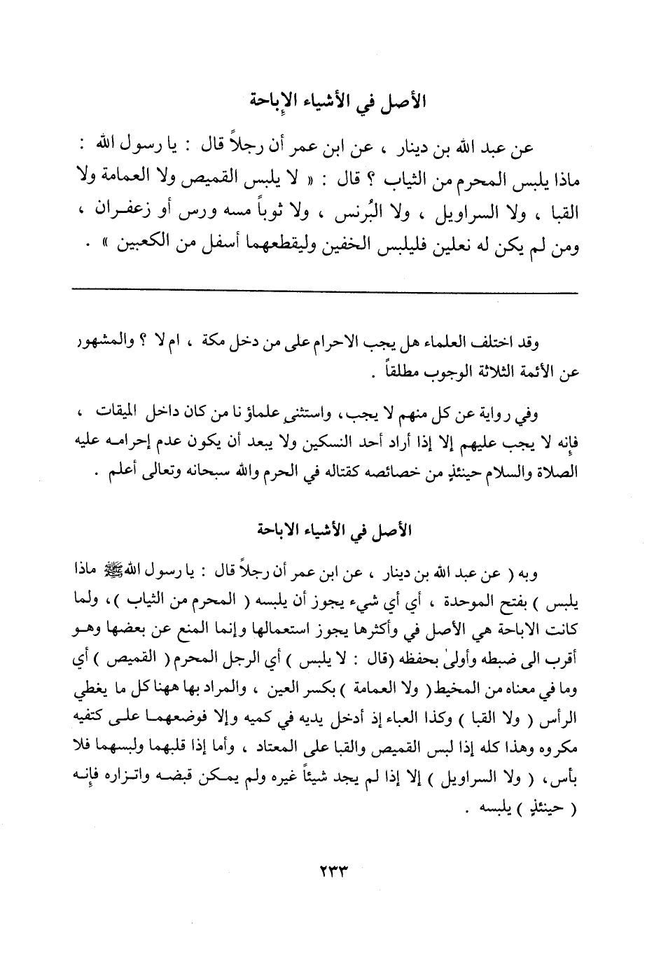 وبه (عن عبد الله بن دينار، عن ابن عمر أن رجلاً قال: يا رسول الله ماذا يلبس) بفتح الموحدة، أي أي شيء يجوز أن يلبسه (المحرم من الثياب)، ولما كانت الإباحة هي الأصل في أكثرها يجوز استعمالها وإنما المنع عن بعضها وهو أقرب إلى ضبطه وأولى بحفظه (قال: لا يلبس) أي الرجل المحرم (القميص) أي وما في معناه من المخيط (ولا العمامة) بكسر العين، والمراد بها ههنا كل ما يغطي الرأس (ولا القبا) وكذا العباء إذا أدخل يديه في كميه وإلا فوضعهما على كتفيه مكروه وهذا كله إذا لبس القميص والقبا على المعتاد، وأما إذا قلبهما ولبسهما فلا بأس، (ولا السراويل) إلا إذا لم يجد شيئاً غيره ولم يمكن قبضه واتزاره فإنه (حينئذٍ) يلبسه.