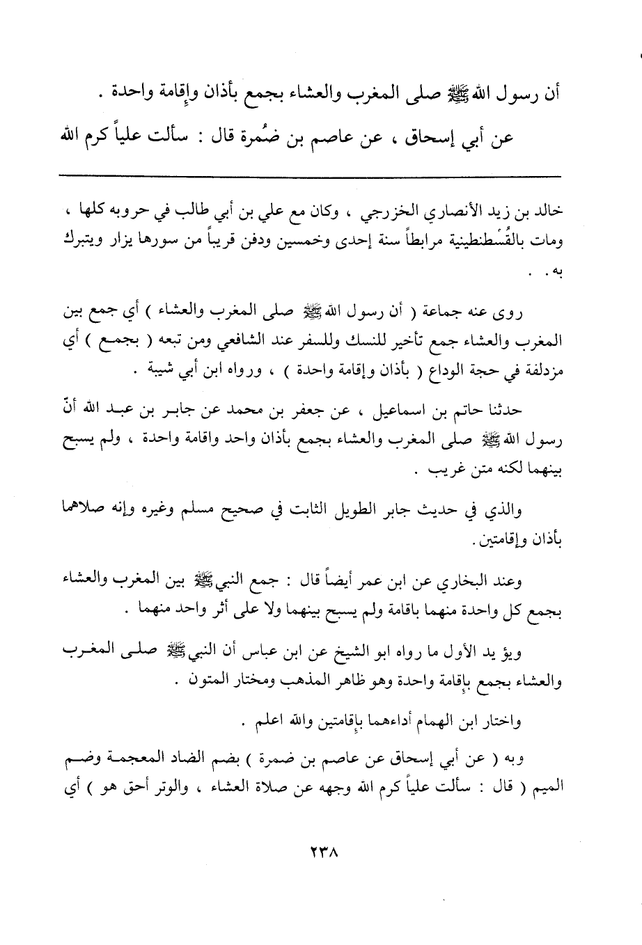 وبه (عن أبي إسحاق عن عاصم بن ضمرة) بضم الضاد المعجمة وضم الميم (قال: سألت علياً كرم الله وجهه عن صلاة العشاء، والوتر أحق هو) أي