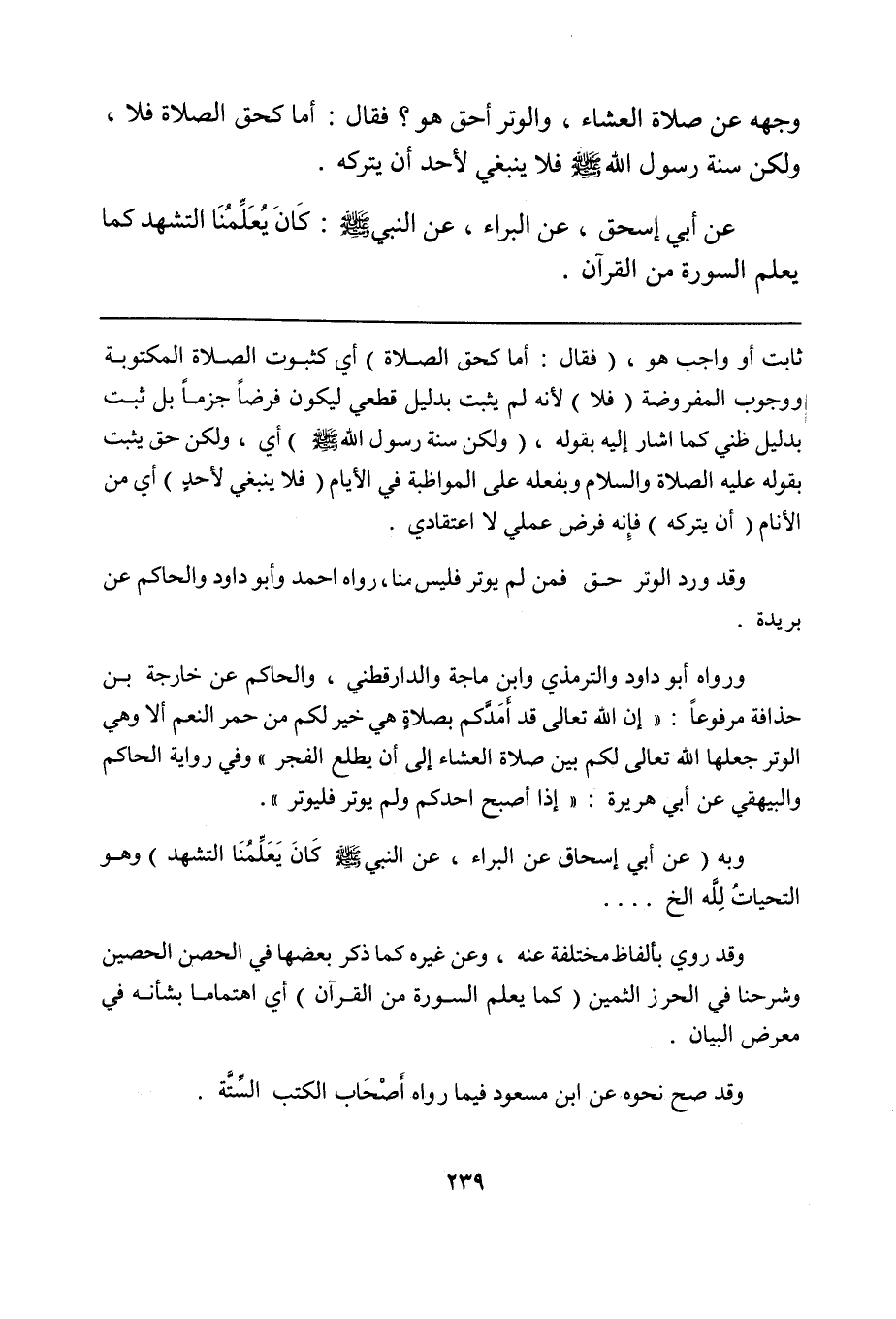 ورواه أبو داود والترمذي وابن ماجه والدارقطني، والحاكم عن خارجة بن حذافة مرفوعاً: "إن الله تعالى قد أَمَدَّكم بصلاةٍ هي خير لكم من حمر النعم ألا وهي الوتر جعلها الله تعالى لكم بين صلاة العشاء إلى أن يطلع الفجر" وفي رواية الحاكم والبيهقي عن أبي هريرة: "إذا أصبح أحدكم ولم يوتر فليوتر".