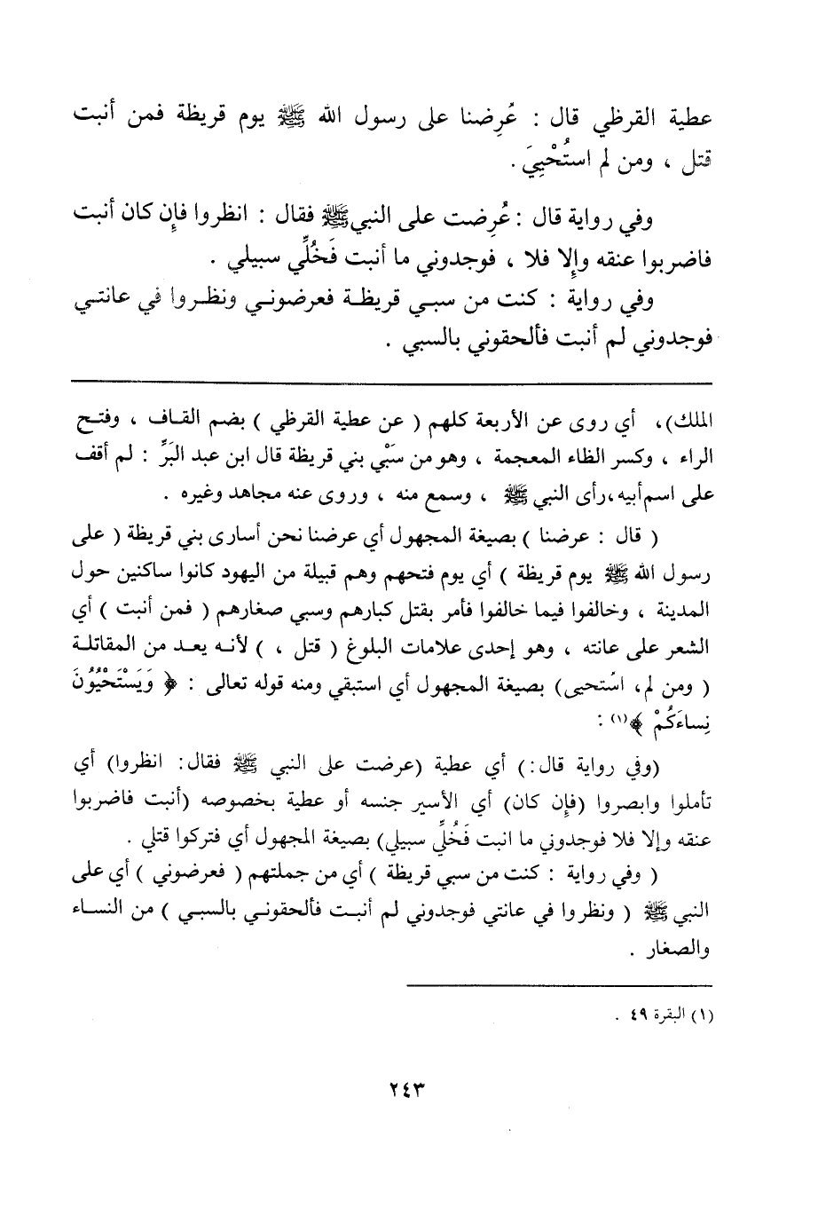 (قال: عرضنا) بصيغة المجهول أي عرضنا نحن أسارى بني قريظة (على رسول الله صلى الله عليه وسلم يوم قريظة) أي يوم فتحهم وهم قبيلة من اليهود كانوا ساكنين حول المدينة، وخالفوا فيما خالفوا فأمر بقتل كبارهم وسبي صغارهم (فمن أنبت) أي الشعر على عانته، وهو إحدى علامات البلوغ (قتل) لأنه يعد من المقاتلة (ومن لم، اسُتحيي) بصيغة المجهول أي استبقي ومنه قوله تعالى: {وَيَسْتَحْيُوُنَ نِساءَكُمْ} (¬1)