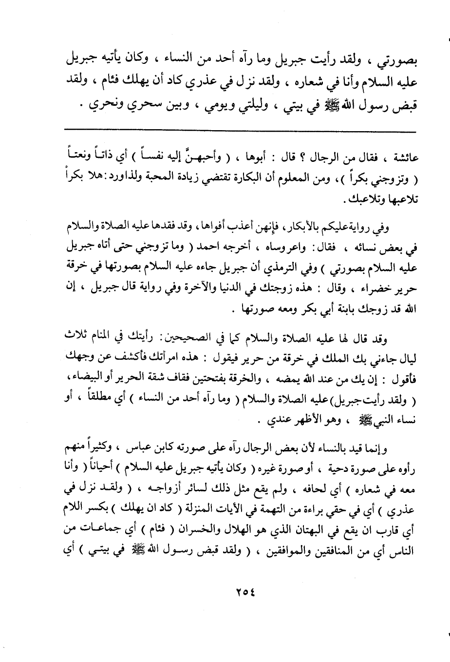 وإنما قيد بالنساء لأن بعض الرجال رآه على صورته كابن عباس، وكثيراً منهم رأوه على صورة دحية، أو صورة غيره (وكان يأتيه جبريل عليه السلام) أحياناً (وأنا معه في شعاره) أي لحافه، ولم يقع مثل ذلك لسائر أزواجه، (ولقد نزل في عذري) أي في حقي براءة من التهمة في الآيات المنزلة (كاد أن يهلك) بكسر اللام أي قارب أن يقع في البهتان الذي هو الهلاك والخسران (فئام) أي جماعات من الناس أي من المنافقين والموافقين، (ولقد قبض رسول الله صلى الله عليه وسلم في بيتي) أي