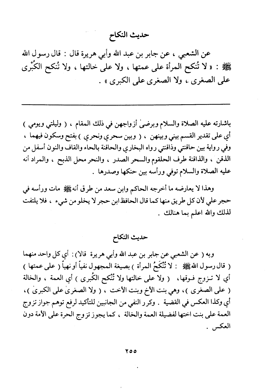 وبه (عن الشعبي عن جابر بن عبد الله وأبي هريرة قالا): أي كل واحد منهما (قال رسول الله صلى الله عليه وسلم: لا تُنْكَحُ المرأة) بصيغة المجهول نفياً أو نهياً (على عمتها) أي لا تزوج فوقها، (ولا على خالتها ولا تُنْكح الكُبرى) أي العمة، والخالة (على الصغرى)، وهي بنت الأخ وبنت الأخت، (ولا الصغرى على الكبرى)، أي وكذا العكس في القضية.
