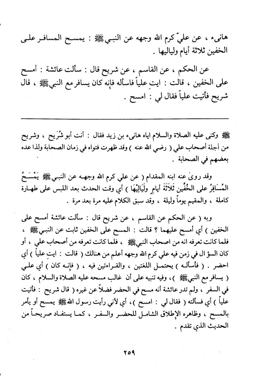 وقد روى عنه ابنه المقدام (عن علي كرم الله وجهه عن النبي صلى الله عليه وسلم يَمْسَحُ المُسَافِرُ على الخُفَّين ثَلاَثَةَ أيامٍ ولَيَالِيْهَا) أي وقت الحدث بعد اللبس على طهارة كاملة، والمقيم يوماً وليلة، وقد سبق الكلام عليه مرة بعد مرة.
