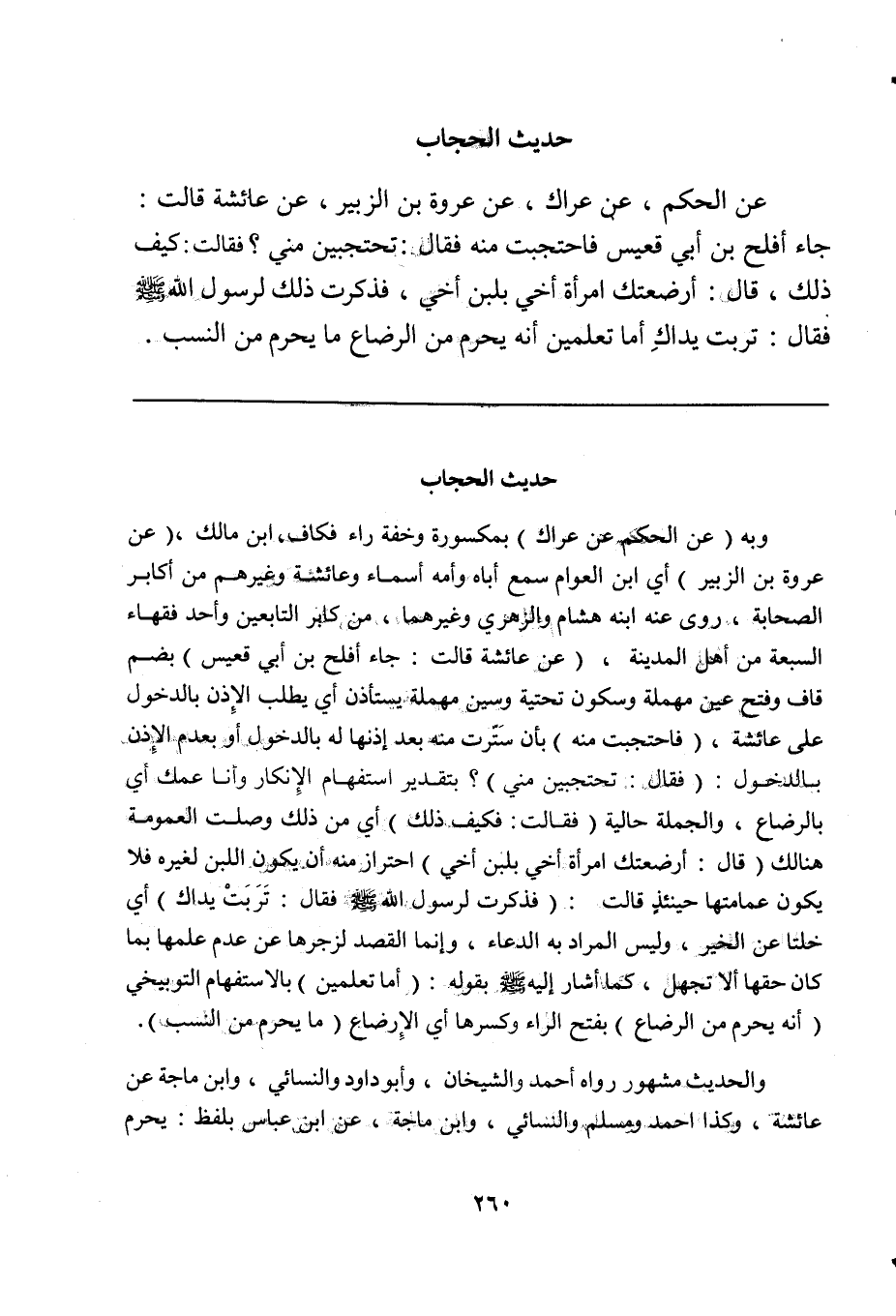 وبه (عن الحكم عن عراك) بمكسورة وخفة راء فكاف، ابن مالك، (عن عروة بن الزبير) أي ابن العوام سمه أباه وأمه أسماء وعائشة وغيرهم من أكابر الصحابة، روى عنه ابنه هشام والزهري وغيرهما، من أكابر التابعين وأحد فقهاء السبعة من أهل المدينة، (عن عائشة قالت: جاء أفلح بن أبي قعيس) بضم قاف وفتح عين مهملة وسكون تحتية وسين مهملة يستأذن أي يطلب الإذن بالدخول على عائشة، (فاحتجبت منه) بأن سَتّرت منه بعد إذنها له بالدخول أو بعدم الإذن بالدخول: (فقال: تحتجبين مني)؟ بتقدير استفهام الإنكار وأنا عمك أي بالرضاع، والجملة حالية (فقالت: فكيف ذلك) أي من ذلك وصلت العمومة هنالك (قال: أرضعتك امرأة أخي بلبن أخي) احتراز منه أن يكون اللبن لغيره فلا يكون عمامتها حينئذٍ قالت: (فذكرت لرسول الله صلى الله عليه وسلم فقال: تَرَبَتْ يداك) أي خلتا عن الخير، وليس المراد به الدعاء، وإنما القصد لزجرها عن عدم علمها بما كان حقها ألا تجهل، كما أشار إليه صلى الله عليه وسلم بقوله: (أما تعلمين) بالاستفهام التوبيخي (أنه يحرم من الرضاع) بفتح الراء وكسرها أي الإرضاع (ما يحرم من النسب).