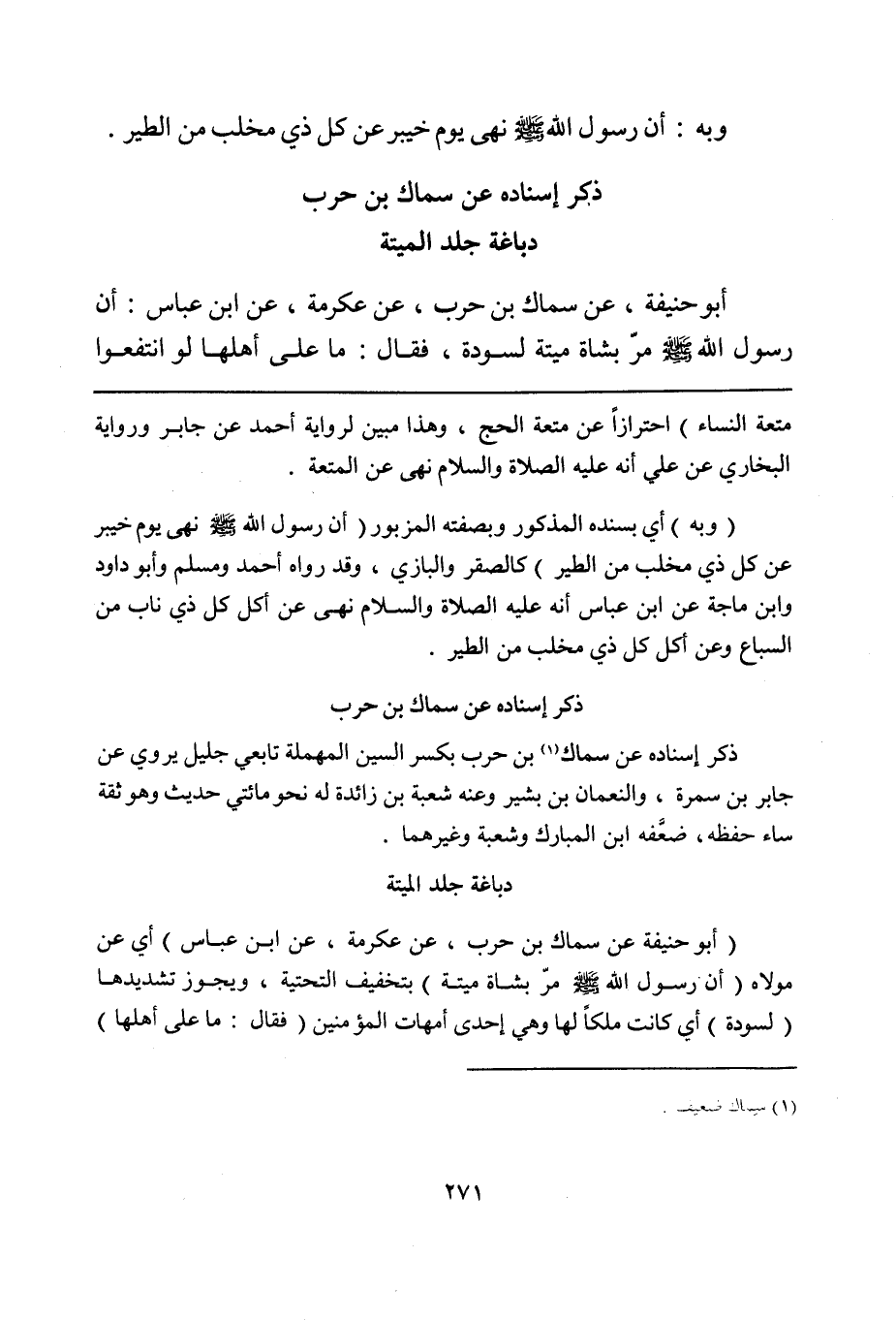 (أبو حنيفة عن سماك بن حرب، عن عكرمة، عن ابن عباس) أي عن مولاه (أن رسول الله صلى الله عليه وسلم مرّ بشاة ميتة) بتخفيف التحتية، ويجوز تشديدها (لسودة) أي كانت ملكاً لها وهي إحدى أمهات المؤمنين (فقال: ما على أهلها)