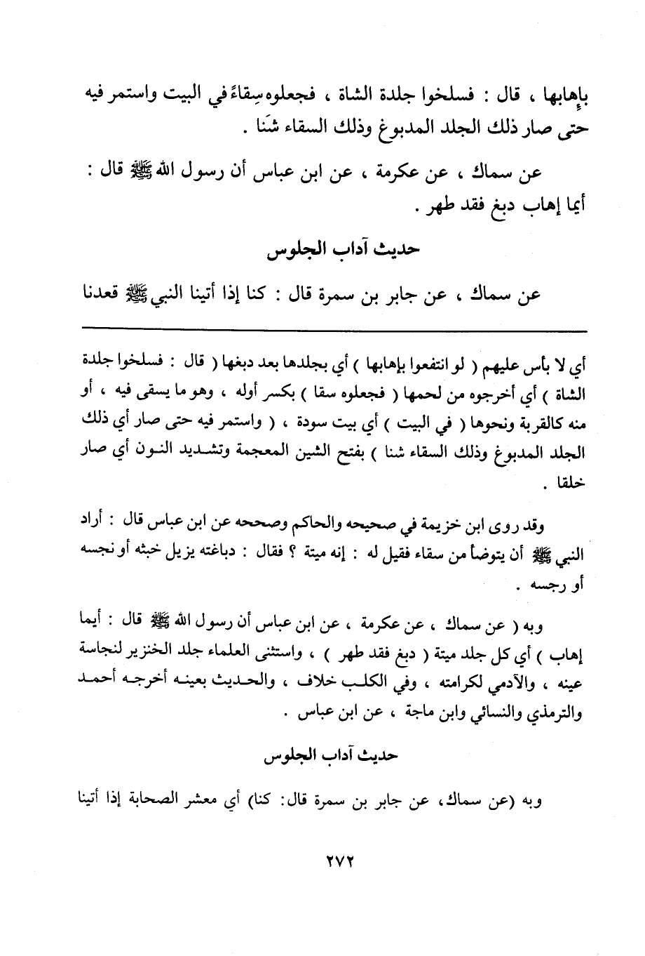 وقد روى ابن خزيمة في صحيحه والحاكم وصححه عن ابن عباس قال: أراد النبي صلى الله عليه وسلم أن يتوضأ من سقاء فقيل له: إنه ميتة؟ فقال: دباغته يزيل خبثه أو نجسه أو رجسه.