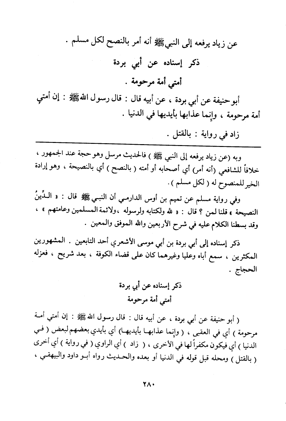 وفي رواية مسلم عن تميم بن أوس الدارمي أن النبي صلى الله عليه وسلم قال: "الدِّينُ النصيحة" قلنا لمن؟ قال: "لله ولكتابه ولرسوله، ولأئمة المسلمين وعامتهم"، وقد بسطنا الكلام عليه في شرح الأربعين والله الموفق والمعين.