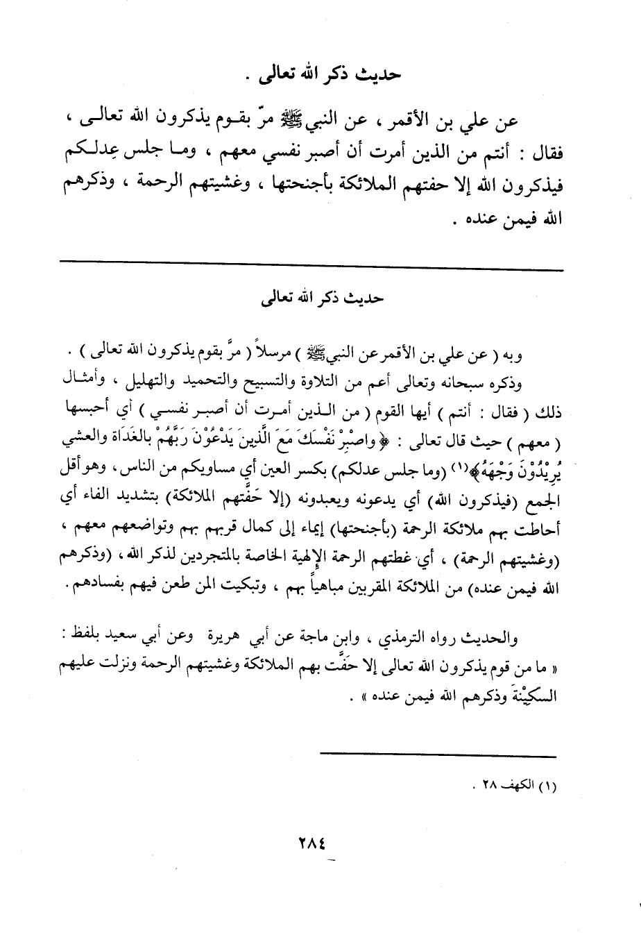 وذكره سبحانه وتعالى أعم من التلاوة والتسبيح والتحميد والتهليل، وأمثال ذلك (فقال: أنتم) أيها القوم (من الذين أمرت أن أصبر نفسي) أي أحبسها (معهم) حيث قال تعالى: {واصْبِرْ نَفْسَكَ مَعَ الَّذِينَ يَدْعُوْنَ رَبَّهُمْ بالغداة والعشي يُرِيْدُونَ وَجْهَهُ} (¬1) (وما جلس عدلكم) بكسر العين أي مساويكم من الناس، وهو أقل الجمع (فيذكرون الله) أي يدعونه ويعبدونه (إلا حَفَّتهم الملائكة) بتشديد الفاء أي أحاطت بهم ملائكة الرحمة (بأجنحتها) إيماء إلى كمال قربهم بهم وتواضعهم معهم، (وغشيتهم الرحمة)، أي غطتهم الرحمة الإلهية الخاصة بالمتجردين لذكر الله، (وذكرهم الله فيمن عنده) من الملائكة المقربين مباهياً بهم.