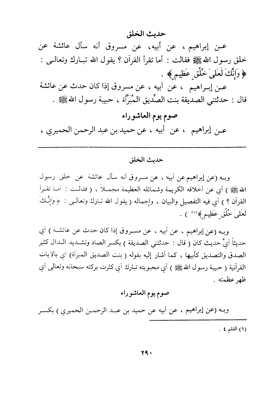 وبه (عن إبراهيم عن أبيه، عن مسروق أنه سأل عائشة عن خلق رسول الله صلى الله عليه وسلم) أي عن أخلاقه الكريمة وشمائله العظيمة مجملاً، (فقالت: أما تقرأ القرآن؟) أي فيه التفصيل والبيان، وإجماله (يقول الله تبارك وتعالى: {وَإنَّكَ لَعَلى خُلُقٍ عَظِيمٍ} (¬1). تبارك أي كثرت بركته سبحانه وتعالى أي ظهر عظمته.