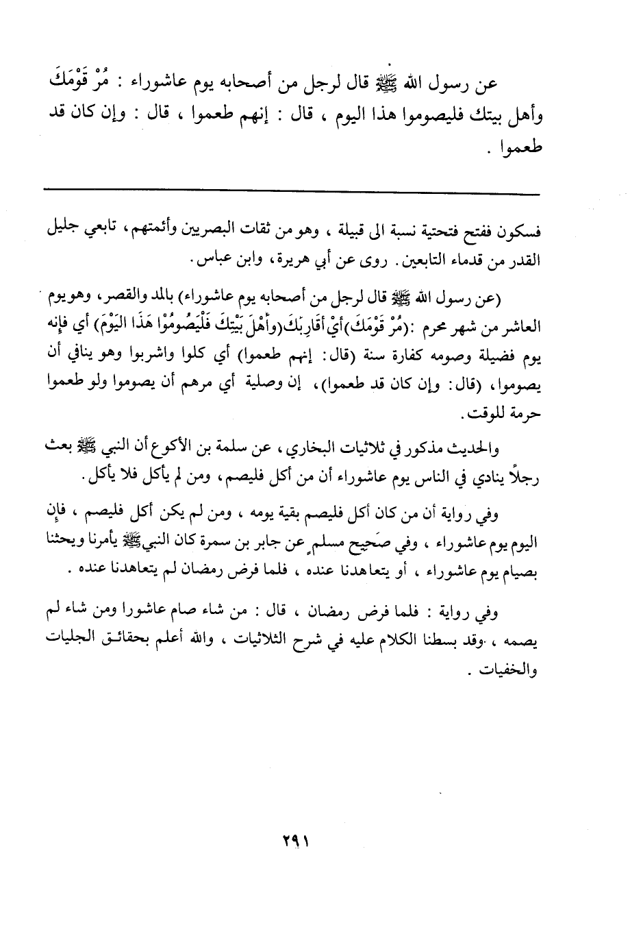والحديث مذكور في ثلاثيات البخاري، عن سلمة بن الأكوع أن النبي صلى الله عليه وسلم بعث رجلاً ينادي في الناس يوم عاشوراء أن من أكل فليصم، ومن لم يأكل فلا يأكل.