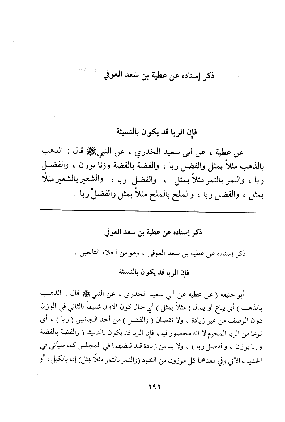 أبو حنيفة (عن عطية عن أبي سعيد الخدري، عن النبي صلى الله عليه وسلم قال: الذهب بالذهب) أي يباع أو يبدل (مثلاً بمثل) أي حال كون الأول شبيهاً بالثاني في الوزن دون الوصف من غير زيادة، ولا نقصان (والفضل) من أحد الجانبين (ربا)، أي نوعاً من الربا المحرم لا أنه محصور فيه، فإن الربا قد يكون بالنسيئة (والفضة بالفضة وزناً بوزن، والفضل ربا)، ولا بد من زيادة قيد قبضهما في المجلس كما سيأتي في الحديث الآتي وفي معناهما كل موزون من النقود (والتمر بالتمر مثلاً بمثل) إما بالكيل، أو