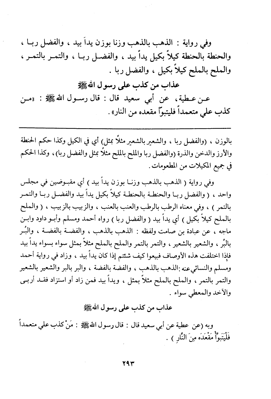 وفي رواية (الذهب بالذهب وزناً بوزن يداً بيد) أي مقبوضين في مجلس واحد، (والفضل ربا والحنطة بالحنطة كيلاً بكيل يداً بيد والفضل ربا والتمر بالتمر)، وفي معناه الرطب بالرطب والعنب بالعنب، والزبيب بالزبيب، (والملح بالملح كيلاً بكيل) أي يداً بيد (والفضل ربا) رواه أحمد ومسلم وأبو دواد وابن ماجه، عن عبادة بن صامت ولفظه: الذهب بالذهب، والفضة بالفضة، والبُر بالبُر، والشعير بالشعير، والتمر بالتمر والملح بالملح مثلاً بمثل سواء بسواء يداً بيد فإذا اختلفت هذه الأوصاف فبيعوا كيف شئتم إذا كان يداً بيد، وزاد في رواية أحمد ومسلم والنسائي عنه: الذهب بالذهب، والفضة بالفضة، والبر بالبر والشعير بالشعير والتمر بالتمر، والملح بالملح مثلاً بمثل، ويداً بيد فمن زاد أو استزاد فقد أربى والآخد والمعطي سواء.