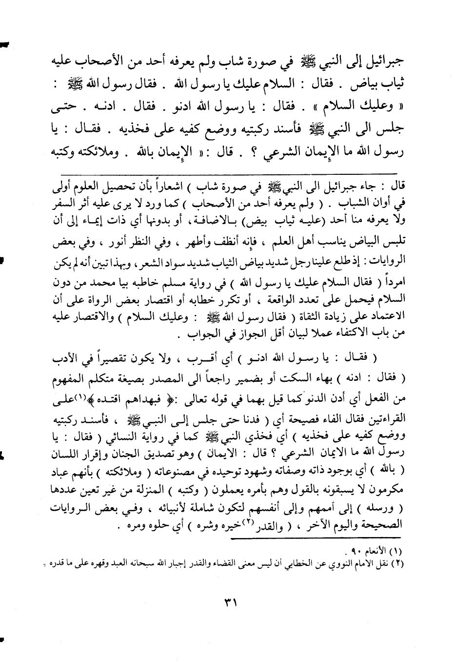 (فقال: يا رسول الله ادنو) أي أقرب، ولا يكون تقصيراً في الأدب (فقال: ادنه) بهاء السكت أو بضمير راجعاً إلى المصدر بصيغة متكلم المفهوم من الفعل أي أدن الدنو كما قيل بهما في قوله تعالى: {فبهداهم اقتده} (¬1) على القراءتين فقال الفاء فصيحة أي (فدنا حتى جلس إلى النبي صلى الله عليه وسلم، فأسند ركبتيه ووضع كفيه على فخذيه) أي فخذي النبي صلى الله عليه وسلم كما في رواية النسائي (فقال: يا رسول الله ما الإيمان الشرعي؟ قال: الإيمان) وهو تصديق الجنان وإقرار اللسان (بالله) أي بوجود ذاته وصفاته وشهود توحيده في مصنوعاته (وملائكته) بأنهم عباد مكرمون لا يسبقونه بالقول وهم بأمره يعملون (وكتبه) المنزلة من غير تعين عددها (ورسله) إلى أممهم وإلى أنفسهم لتكون شاملة لأنبيائه، وفي بعض الروايات الصحيحة واليوم الآخر، (والقدر (¬2) خيره وشره) أي حلوه ومره.