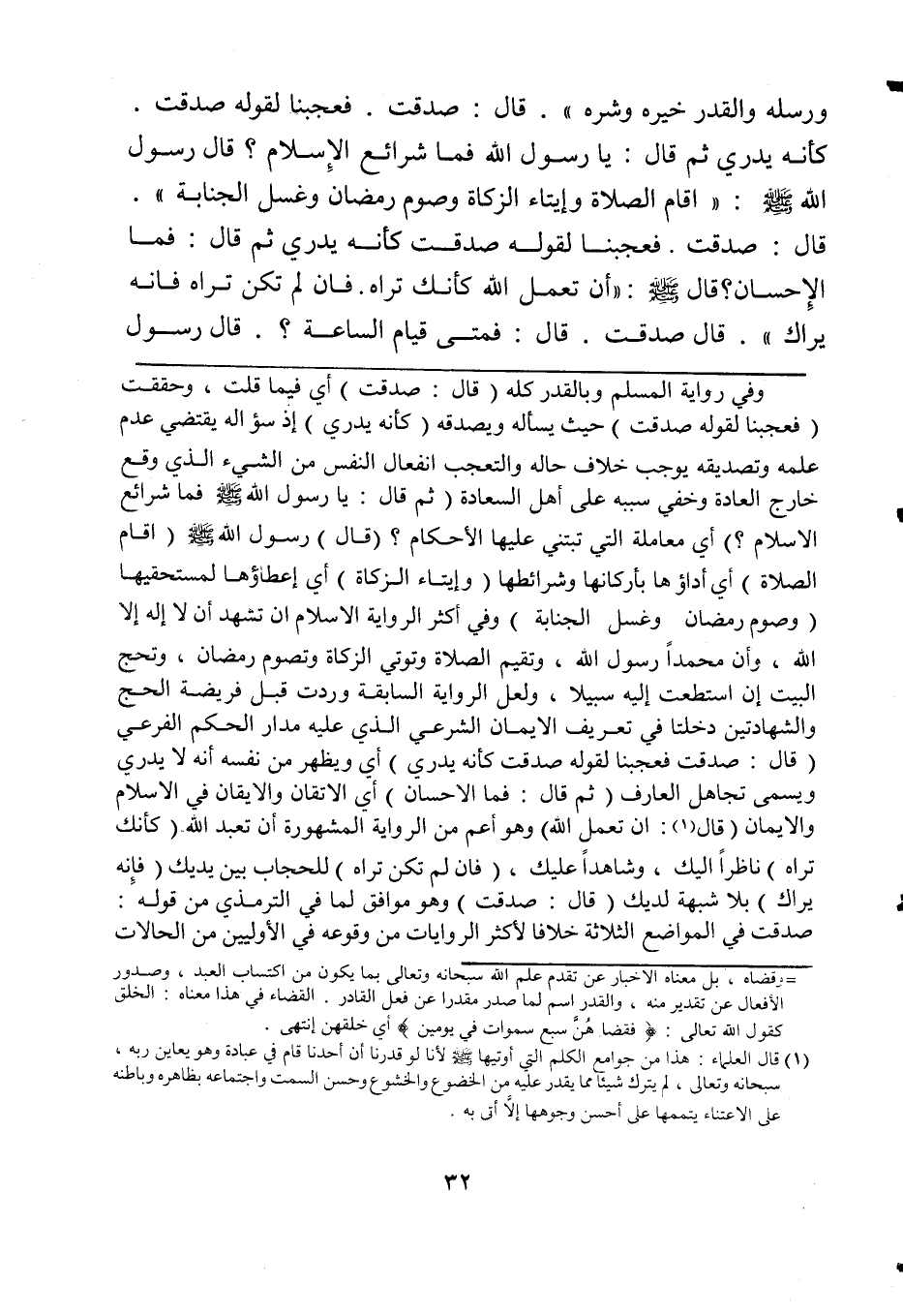 وفي رواية لمسلم وبالقدر كله (قال: صدقت) أي فيما قلت، وحققت (فعجبنا لقوله صدقت) حيث يسأله ويصدقه (كأنه يدري) إذ سؤاله يقتضي عدم علمه وتصديقه يوجب خلاف حاله والتعجب انفعال النفس من الشيء الذي وقع خارج العادة وخفي سببه على أهل السعادة (ثم قال: يارسول الله فما شرائع الإسلام؟) أي معاملة التي تبنى عليها الأحكام؟ (قال) رسول الله صلى الله عليه وسلم (إقام الصلاة) أي أداؤها بأركانها وشرائطها (وإيتاء الزكاة) أي إعطاؤها لمستحقيها (وصوم رمضان وغسل الجنابة) وفي أكثر الرواية الإسلام أن تشهد أن لا إله إلا الله، وأن محمداً رسول الله، وتقيم الصلاة وتؤتي الزكاة وتصوم رمضان، وتحج البيت إن استطعت إليه سبيلاً، ولعل الرواية السابقة وردت قبل فريضة الحج والشهادتين دخلتا في تعريف الإيمان الشرعي الذي عليه مدار الحكم الفرعي (قال: صدقت فعجبنا لقوله صدقت كأنه يدري) أي ويظهر من نفسه أنه لا يدري ويسمى تجاهل العارف (ثم قال: فما الإحسان) أي الإتقان والإيقان في الإسلام والإيمان (قال (¬1): أن تعمل الله) وهو أعم من الرواية المشهورة أن تعبد الله (كأنك تراه) ناظراً إليك، وشاهداً عليك، (فإن لم تكن تراه) للحجاب بين يديك (فإنه يراك) بلا شبهة لديك (قال: صدقت) وهو موافق لما في الترمذي من قوله: صدقت في المواضع الثلاثة خلافاً لأكثر الروايات من وقوعه في الأوليين من الحالات