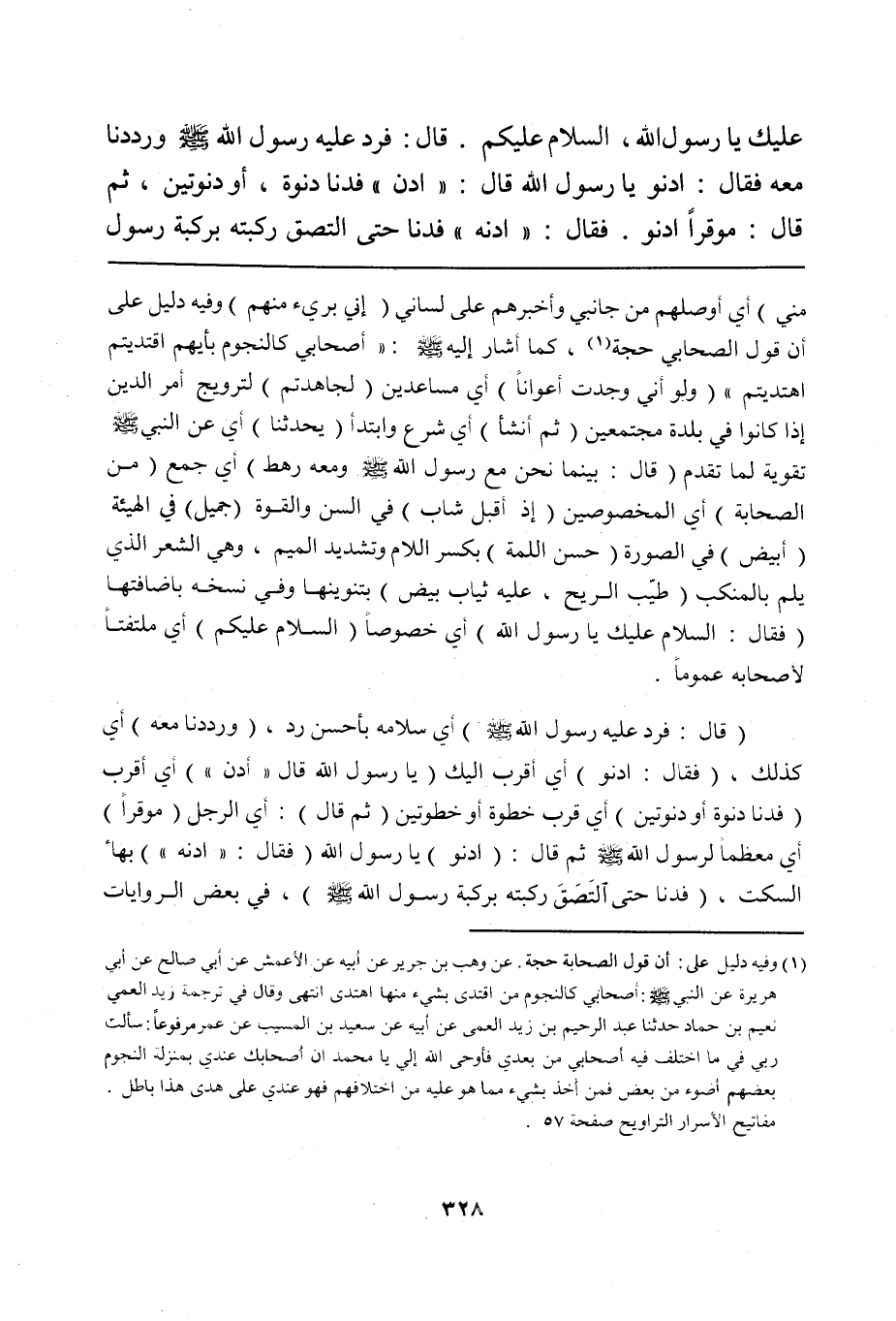(قال: فرد عليه رسول الله صلى الله عليه وسلم) أي سلامه بأحسن رد، (ورددنا معه) أي كذلك، (فقال: ادنو) أي أقرب إليك (يا رسول الله قال "أدن") أي أقرب (فدناه دنوة أو دنوتين) أي قرب خطوة أو خطوتين (ثم قال): أي الرجل (موقراً) أي معظماً لرسول الله صلى الله عليه وسلم ثم قال: (ادنو) يا رسول الله (فقال: "ادنه") بهاء السكت، (فدنا حتى التَصَقَ ركبتيه بركبة رسول الله صلى الله عليه وسلم)، في بعض الروايات