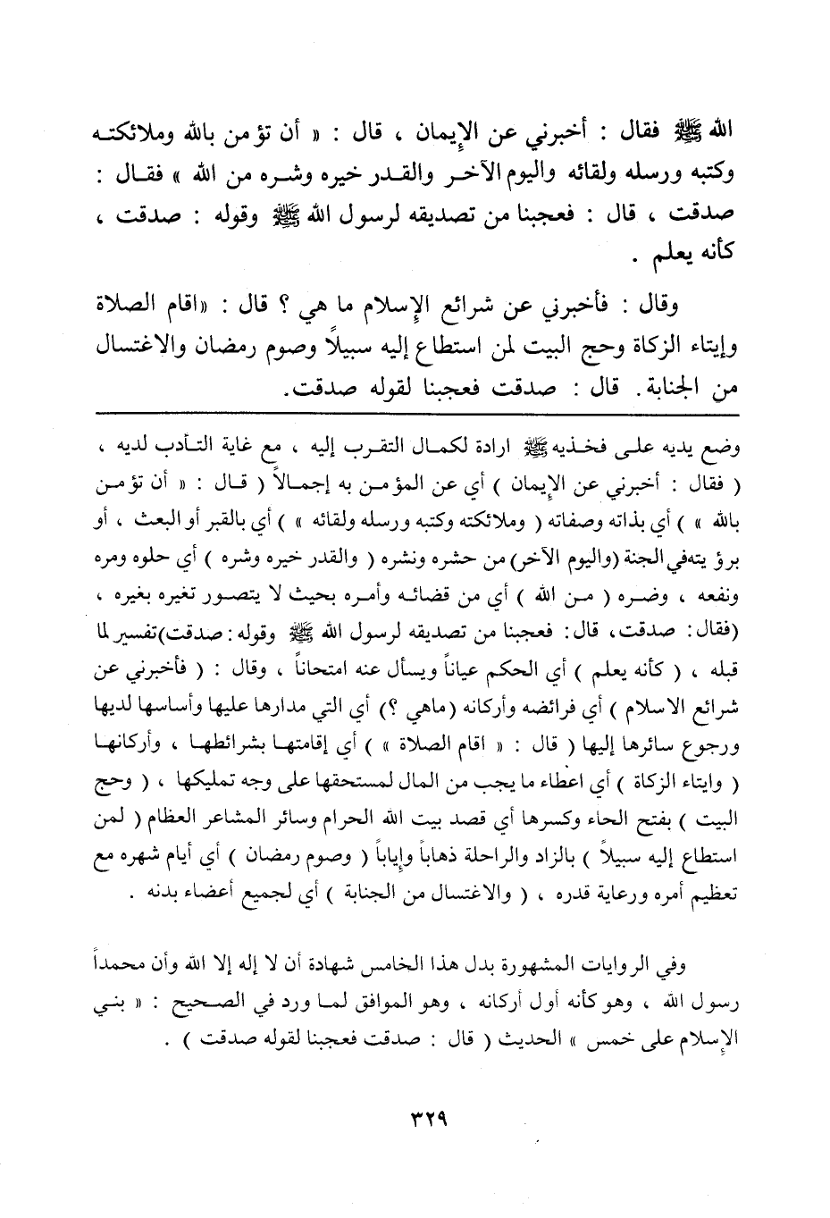 وفي الروايات المشهورة بدل هذا الخامس شهادة أن لا إله إلا الله وأن محمداً رسول الله، وهو كأنه أول أركانه، وهو الموافق لما ورد في الصحيح: "بني الإسلام على خمس" الحديث (قال: صدقت فعجبنا لقوله صدقت).