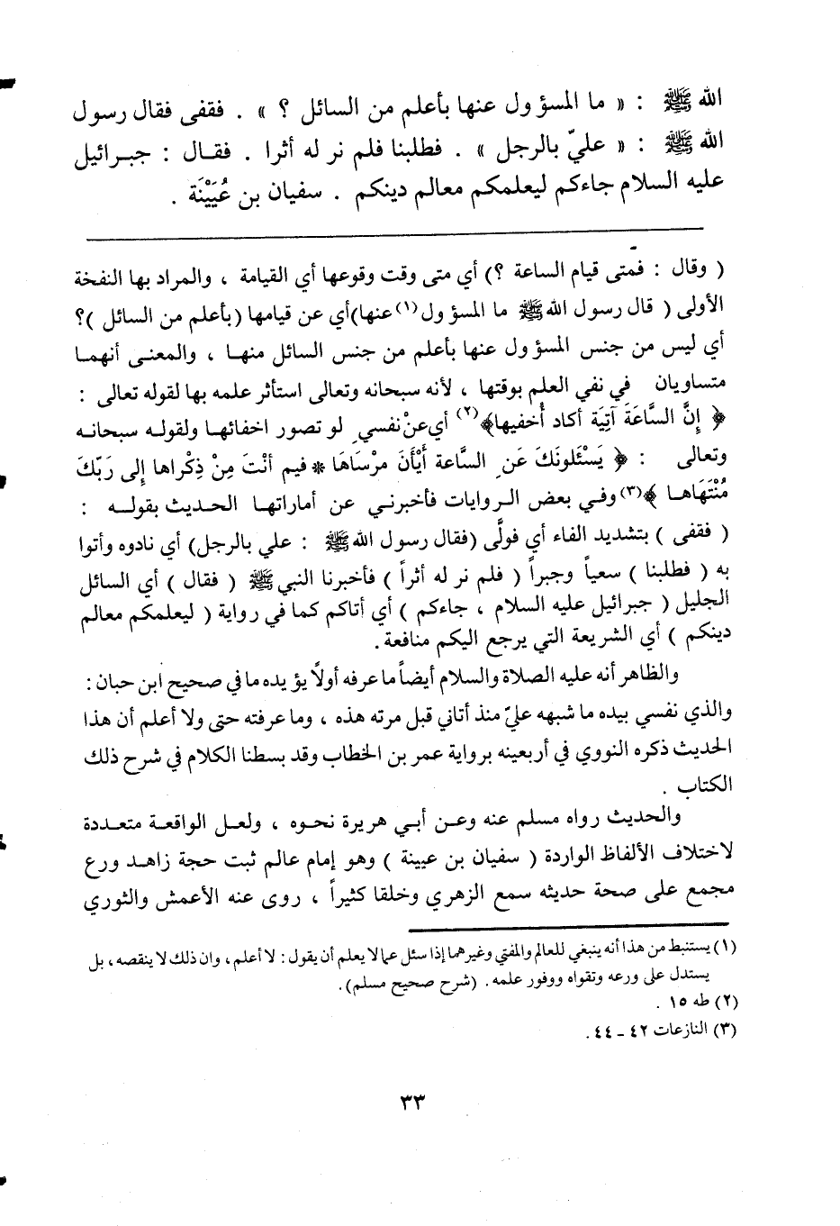 (وقال: فمتى قيام الساعة؟) أي متى وقت وقوعها أي القيامة، والمراد بها النفخة الأولى (قال رسول الله صلى الله عليه وسلم ما المسؤول (¬1) عنها) أي عن قيامها (بأعلم من السائل)؟ أي ليس من جنس المسؤول عنها بأعلم من جنس السائل منها، والمعنى أنهما متساويان في نفي العلم بوقتها، لأنه سبحانه وتعالى استأثر علمه بها لقوله تعالى: {إنَّ السَّاعة آتِيَة أكاد أُخفيها} (¬2) أي عن نفسي لو تصور إخفائها ولقوله سبحانه وتعالى: {يَسْئَلونَكَ عَنِ السَّاعة أَيّانَ مرْسَاهَا فيم أنْتَ مِن ذِكْراها إلى رَبّكَ مُنْتَهاها} (¬3) وفي بعض الروايات فأخبرني عن أماراتها الحديث بقوله: (فقفى) بتشديد الفاء أي فولَّى (فقال رسول الله صلى الله عليه وسلم: علي بالرجل) أي نادوه وأُتوا به (فطلبنا) سعياً وجبراً (فلم نر له أثراً) فأخبرنا النبي صلى الله عليه وسلم (فقال) أي السائل الجليل (جبرائيل عليه السلام، جاءكم) أي أتاكم كما في رواية (ليعلمكم معالم دينكم) أي الشريعة التي يرجع إليكم منافعه.