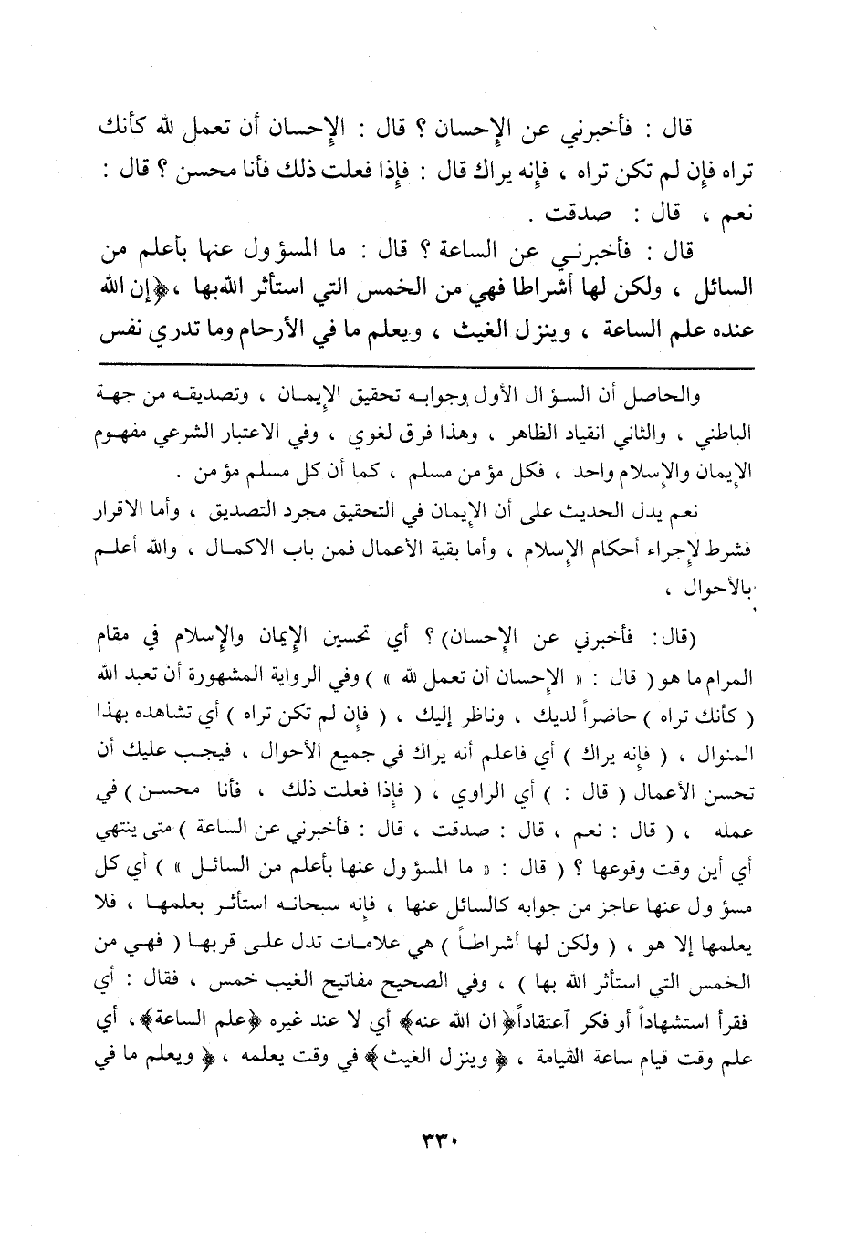 (قال: فأخبرني عن الإحسان)؟ أي تحسين الإيمان والإسلام في مقام المرام ما هو (قال: "الإحسان أن تعمل لله") وفي الرواية المشهورة أن تعبد الله (كأنك تراه) حاضراً لديك، وناظراً إليك، (فإن لم تكن تراه) أي تشاهده بهذا المنوال، (فإنه يراك) أي فاعلم أنه يراك في جميع الأحوال، فيجب عليك أن تحسن الأعمال (قال:) أي الراوي، (فإذا فعلت ذلك، فأنا محسن) في عمله، (قال: نعم، قال: صدقت، قال: فأخبرني عن الساعة) متى ينتهي أي أين وقت وقوعها؟ (قال: "ما المسؤول عنها بأعلم من السائل") أي كل مسؤول عنها عاجز من جوابه كالسائل عنها، فإنه سبحانه استأثر بعلمها، فلا يعلمها إلا هو، (ولكن لها أشراطاً) هي علامات تدل على قربها (فهي من الخمس التي استأثر الله بها)، وفي الصحيح مفاتيح الغيب الخمس، فقال: أي فقرأ استشهاداً أو فكر اعتقاداً {إن الله عنده} أي لا عند غيره {علم الساعة}، أي علم وقت قيام ساعة القيامة، {وينزل الغيث} في وقت يعلمه، {ويعلم ما في
