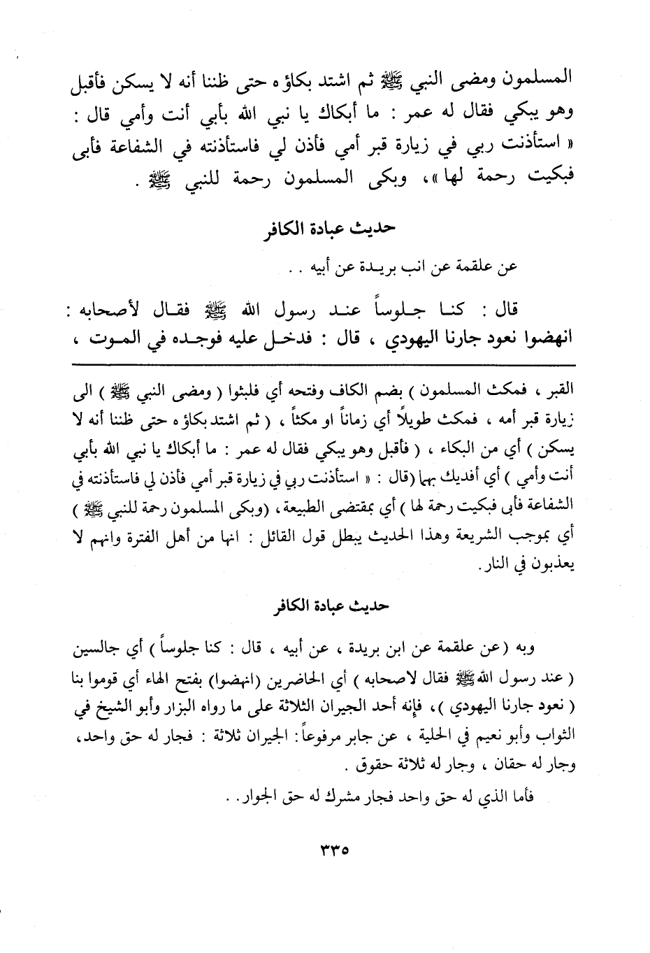 وبه (عن علقمة عن ابن بريدة، عن أبيه، قال: كنا جلوساً) أي جالسين (عند رسول الله صلى الله عليه وسلم فقال لأصحابه) أي الحاضرين (انهضوا) بفتح الهاء أي قوموا بنا (نعود جارنا اليهودي)، فإنه أحد الجيران الثلاثة على ما رواه البزار وأبو الشيخ في الثواب وأبو نعيم في الحلية، عن جابر مرفوعاً: الجيران ثلاثة: فجار له حق واحد، وجار له حقان، وجار له ثلاثة حقوق.