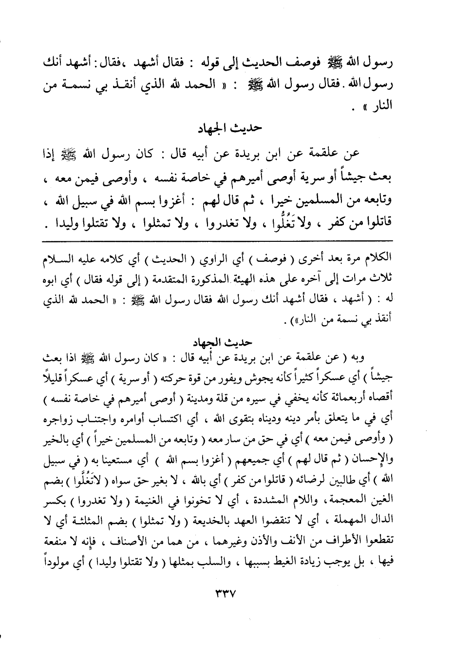وبه (عن علقمة عن ابن بريدة عن أبيه قال: "كان رسول الله صلى الله عليه وسلم إذا بعث جيشاً) أي عسكراً كثيراً كأنه يجوش ويفور من قوة حركته (أو سرية) أي عسكراً قليلاً أقصاه أربعمائة كأنه يخفي في سيره من قلة ومدينة (أوصى أميرهم في خاصة نفسه) أي في ما يتعلق بأمر دينه ودنياه بتقوى الله، أي اكتساب أوامره واجتناب زواجره (وأوصى فيمن معه) أي في حق من سار معه (وتابعه من المسلمين خيراً) أي بالخير والإحسان (ثم قال لهم) أي جميعهم (اغزوا بسم الله) أي مستعيناً به (في سبيل الله) أي طالبين لرضائه (قاتلوا من كفر) أي بالله، لا بغير حق سواه (لا تَغلُّوا) بضم الغين المعجمة، واللام المشددة، أي لا تخونوا في الغنيمة (ولا تغدروا) بكسر الدال المهملة، أي لا تنقضوا العهد بالخديعة (ولا تمثلوا) بضم المثلثة أي لا تقطعوا الأطراف من الأنف والأذن وغيرهما، من هما من الأصناف، فإنه لا منفعة فيها، بل يوجب زيادة الغيظ بسببها، والسلب بمثلها (ولا تقتلوا وليداً) أي مولوداً