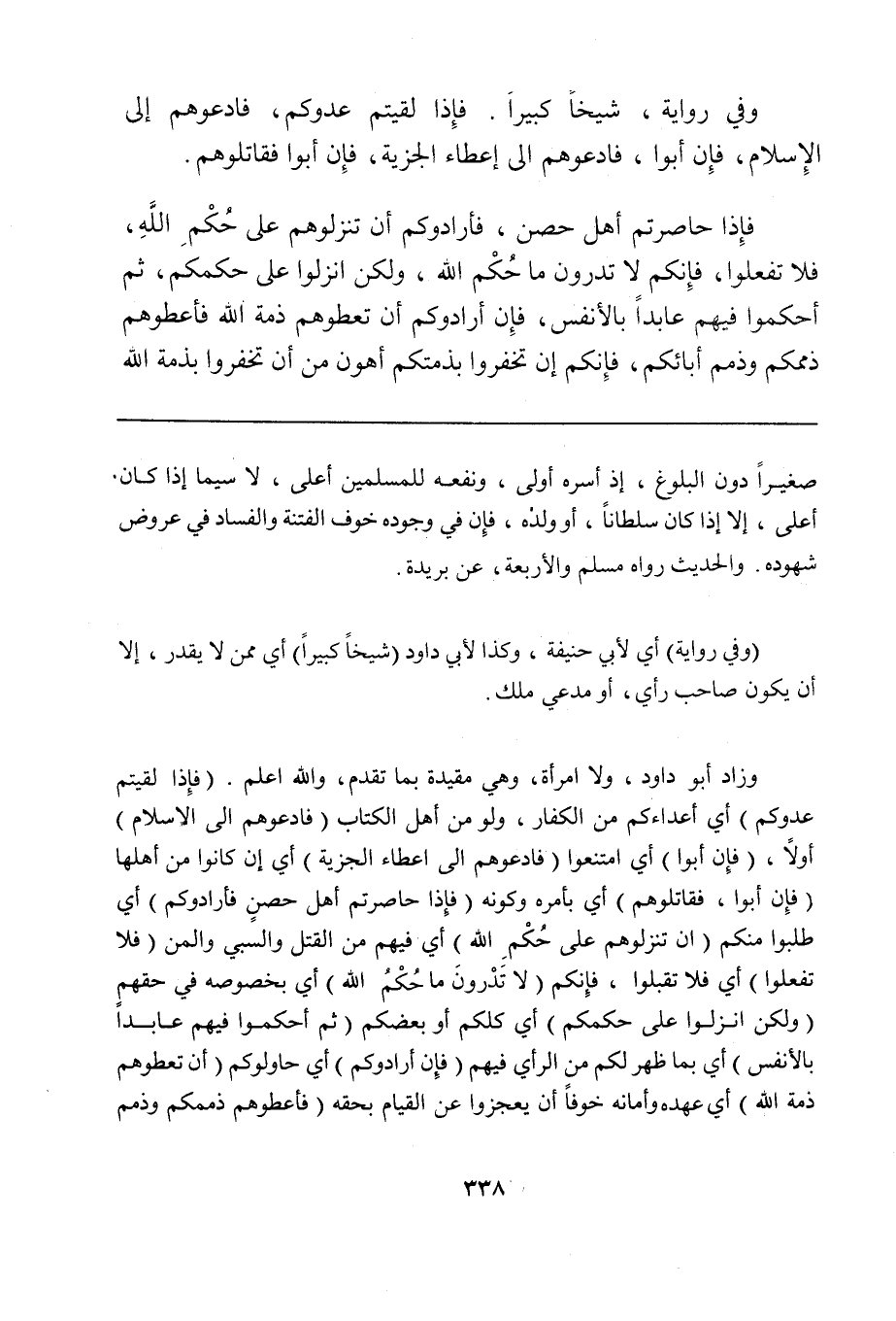 وزاد أبو داود، ولا امرأة، وهي مقيدة بما تقدم، والله أعلم. (فإذا لقيتم عدوكم) أي أعداءكم من الكفار، ولو من أهل الكتاب (فادعوهم إلى الإسلام) أولاً، (فإن أبوا) أي امتنعوا (فادعوهم إلى إعطاء الجزية) أي إن كانوا من أهلها (فإن أبوا، فقاتلوهم) أي بأمره وكونه (فإذا حاصرتم أهل حصنٍ فأرادوكم) أي طلبوا منكم (أن تنزلوهم على حُكْمِ الله) أي فيهم من القتل والسبي والمن (فلا تفعلوا) أي فلا تقبلوا، فإنكم (لا تَدْرونَ ما حُكْمُ الله) أي بخصوصه في حقهم (ولكن انزلوا على حكمكم) أي كلكم أو بعضكم (ثم أحكموا فيهم عابداً بالأنفس) أي بما ظهر لكم من الرأي فيهم (فإن أرادوكم) أي حاولوكم (أن تعطوهم ذمة الله) أي عهده وأمانه خوفاً أن يعجزوا عن القيام بحقه (فأعطوهم ذممكم وذمم
