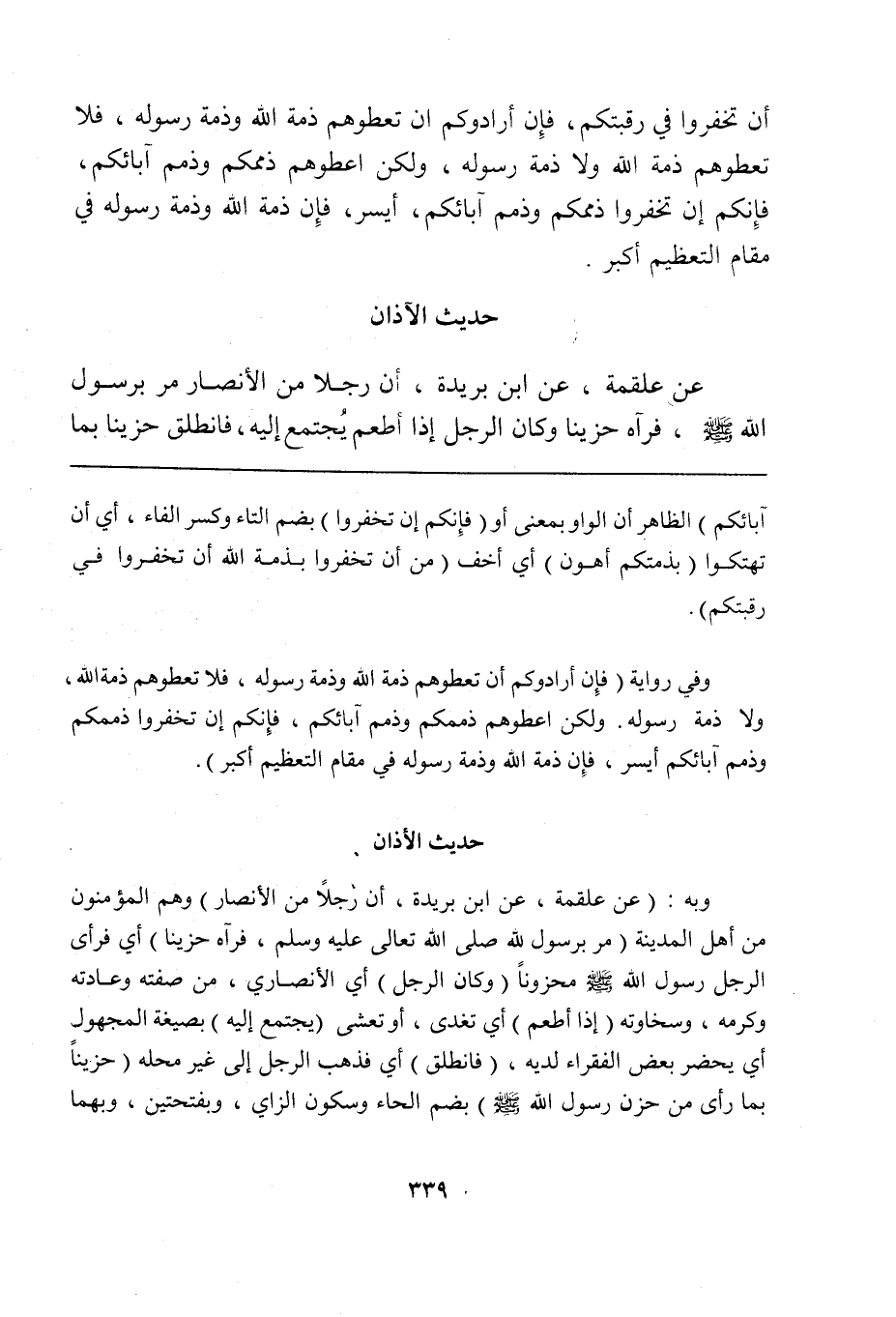 وبه: (عن علقمة، عن ابن بريدة، أن رجلاً من الأنصار) وهم المؤمنون من أهل المدينة (مر برسول الله صلى الله تعالى عليه وسلم، فرآه حزيناً) أي فرأى الرجل رسول الله صلى الله عليه وسلم محزوناً (وكان الرجل) أي الأنصاري، من صفته وعادته وكرمه، وسخاوته (إذا أطعم) أي تغدى، أو تعشى (يجتمع إليه) بصيغة المجهول أي يحضر بعض الفقراء لديه، (فانطلق) أي فذهب الرجل إلى غير محله (حزيناً بما رأى من حزن رسول الله صلى الله عليه وسلم) بضم الحاء وسكون الزاي، وبفتحتين، وبهما