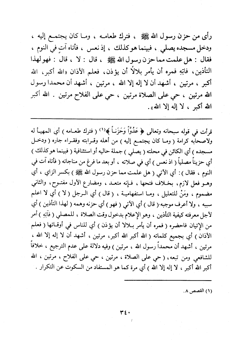 قرأت في قوله سبحانه وتعالى {عَدُوَّاً وَحَزَناً} (¬1) (فترك طعامه) أي المهيأ له ولأصحابه كرامة (وما كان يجتمع إليه) من أهله وقرابته وفقراء جاره (ودخل مسجده) أي الكائن في محلته (يصلي) جملة حالية أو استئنافية (فبينما هو كذلك) أي حزيناً مصلياً (إذ نعس) أي في صلاته، أو بعد ما فرغ من مناجاته (فأتاه آت في النوم، فقال): أي الآتي (هل علمت مما حزن رسول الله صلى الله عليه وسلم) بكسر الزاي، أي وهو فعل لازم، بخلاف فتحها، فإنه متعد، ومضارع الأول مفتوح، والثاني مضموم، ومَنْ للتعليل، وما استفهامية، (قال) أي الرجل (لا) أي لا أعلم سببه، ولا أعرف موجبه (قال) أي الآتي (فهو) أي حزنه وهمه (لهذا التأذين) أي لأجل معرفته كيفية التأذين، وهو الإعلام بدخول وقت الصلاة، للمصلي (فآتِهِ) أمر من الإتيان فأحضره (فمره أن يأمر بلالاً أن يؤذن) أي للناس في أوقاتها (فعلم الأذان) أي بجميع كلماته (الله اكبر الله أكبر، مرتين، أشهد أن لا إله إلا الله، مرتين، أشهد ان محمداً رسول الله، مرتين) وفيه دلالة على عدم الترجيع، خلافاً للشافعي ومن تبعه، (حي على الصلاة، مرتين، حي على الفلاح، مرتين، الله أكبر الله أكبر، لا إله إلا الله) أي مرة كما هو المستفاد من السكوت عن التكرار.