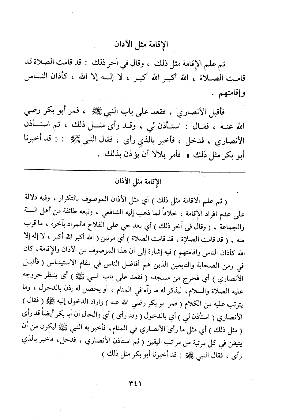 (ثم علم الإقامة مثل ذلك) أي مثل الأذان الموصوف بالتكرار، وفيه دلالة على عدم إفراد الإقامة، خلافاً لما ذهب إليه الشافعي، وتبعه طائفة من أهل السنة والجماعة، (وقال في آخر ذلك) أي بعد حي على الفلاح فالمراد بآخره، ما قرب منه، (قد قامت الصلاة، قد قامت الصلاة) أي مرتين (الله أكبر الله أكبر، لا إله إلا الله كأذان الناس وإقامتهم) فيه إشارة إلى أن هذا الموصوف من الأذان والإقامة، كان في زمن الصحابة والتابعين الذين هم أفاضل الناس في مقام الاستيناس (فأقبل الأنصاري) أي فخرج من مسجده (فقعد على باب النبي صلى الله عليه وسلم) أي ينتظر خروجه عليه الصلاة والسلام ليذكر له ما رآه في المنام، أو يحصل له إذن بالدخول، وما يترتب عليه من الكلام (فمر أبو بكر رضي الله عنه) وأراد الدخول إليه صلى الله عليه وسلم (فقال) الأنصاري (استأذن لي) أي بالدخول (وقد رأى) أي والحال أن أبا بكر أيضاً قد رأى (مثل ذلك) أي مثل ما رأى الأنصاري في المنام، فأخبر به النبي صلى الله عليه وسلم ليكون من أن يتيقن في كل مرتبة من مراتب اليقين (ثم استأذن الأنصاري، فدخل، فأخبر بالذي رأى، فقال النبي صلى الله عليه وسلم: قد أخبرنا أبو بكر مثل ذلك)